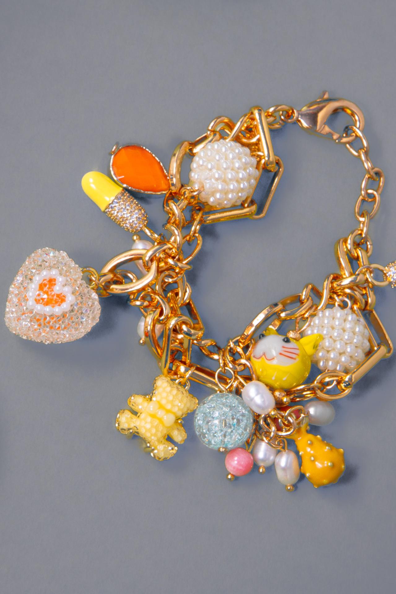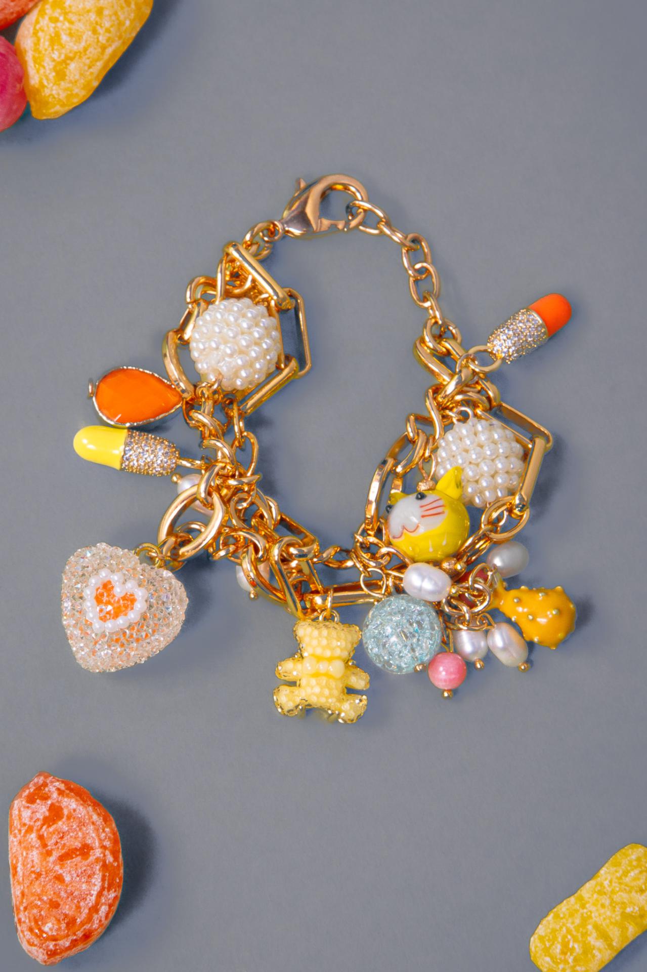 Each charm tells a playful story: from the yellow beaded teddy bear to the glittering orange crystal heart, pearl-embellished buttons, and not one but two miniature lipstick pendants, all kissed with sparkle. The unexpected is everywhere iridescent beads, painted kitty charms, and playful bubble details make this piece a standout in every direction.