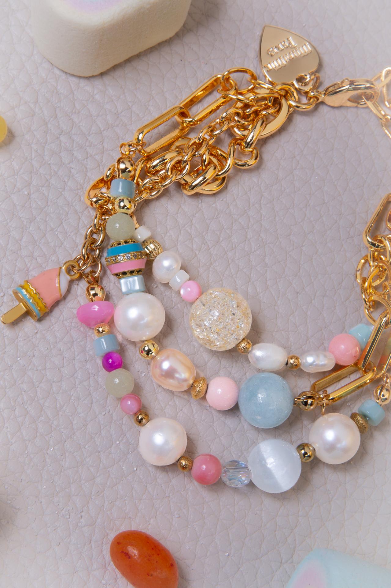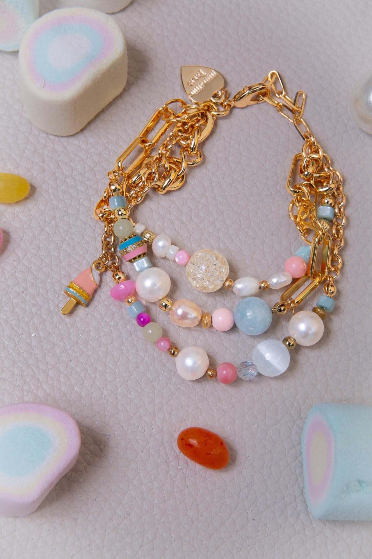 Soft, colorful, and full of joy, the Sweet Scoop Bracelet is a pastel daydream crafted in 18K gold-plated stainless steel. Designed with real gemstone beads, glass accents, freshwater pearls, and a playful enamel ice-cream charm, it brings sweetness and summer energy to any look.