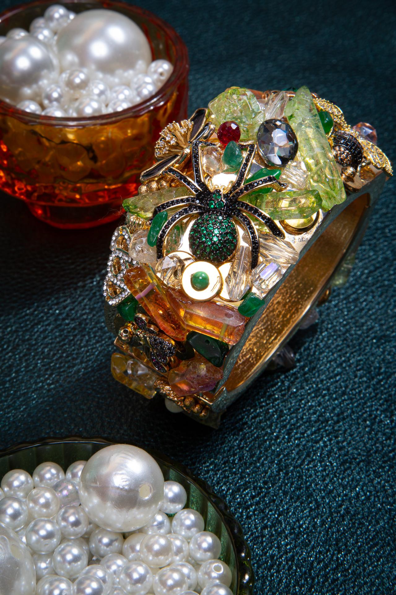 Surrounding the spider is a textured mix of raw-style stones—citrine yellow, peridot green, smoky quartz tones, jade hues—and mineral-inspired glass pieces. Gold botanical accents, black crystal settings, resin details, and sculpted elements add depth, contrast, and a hauntingly beautiful finish. Every cuff is hand-assembled for a unique, asymmetric composition.