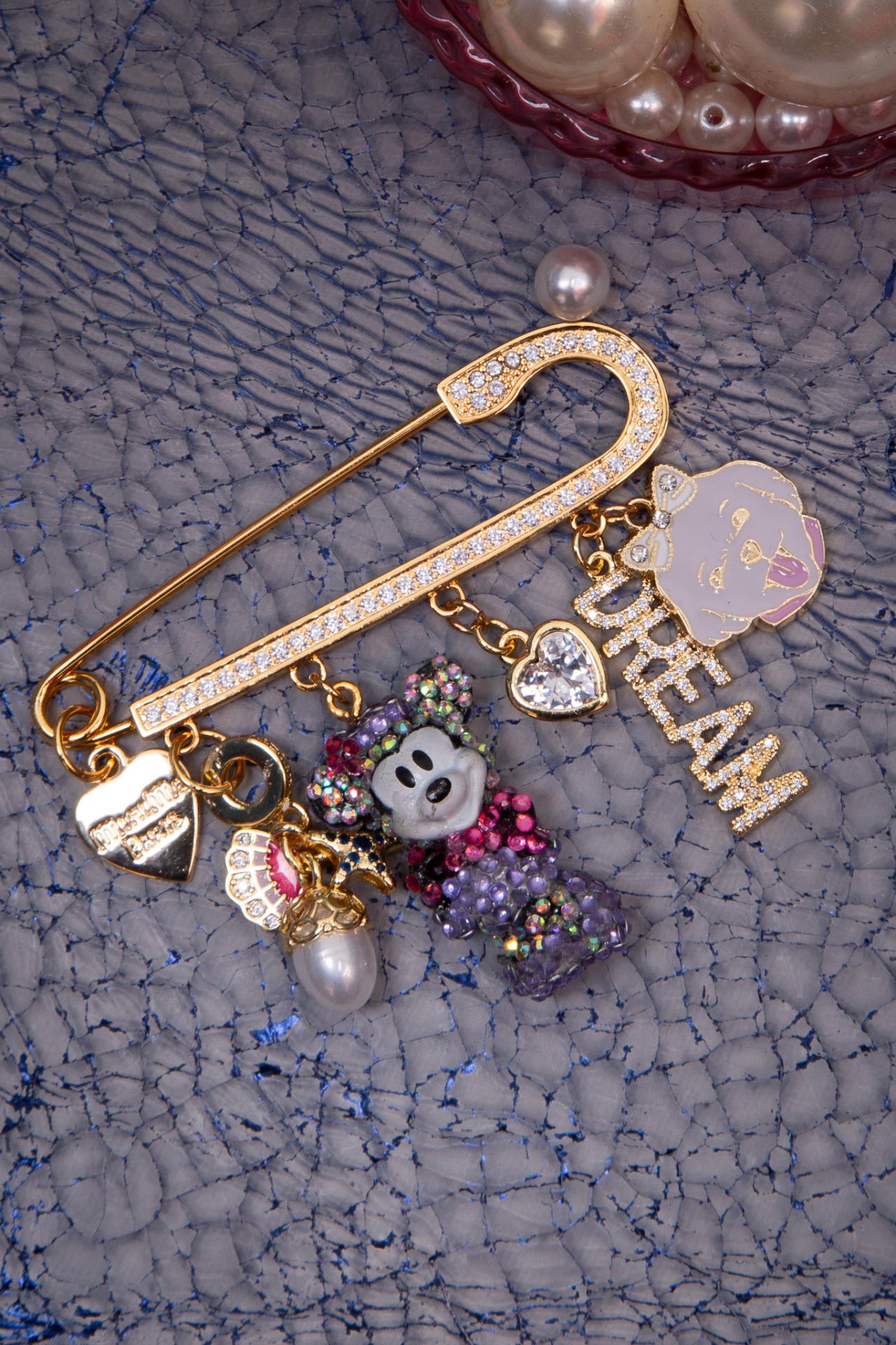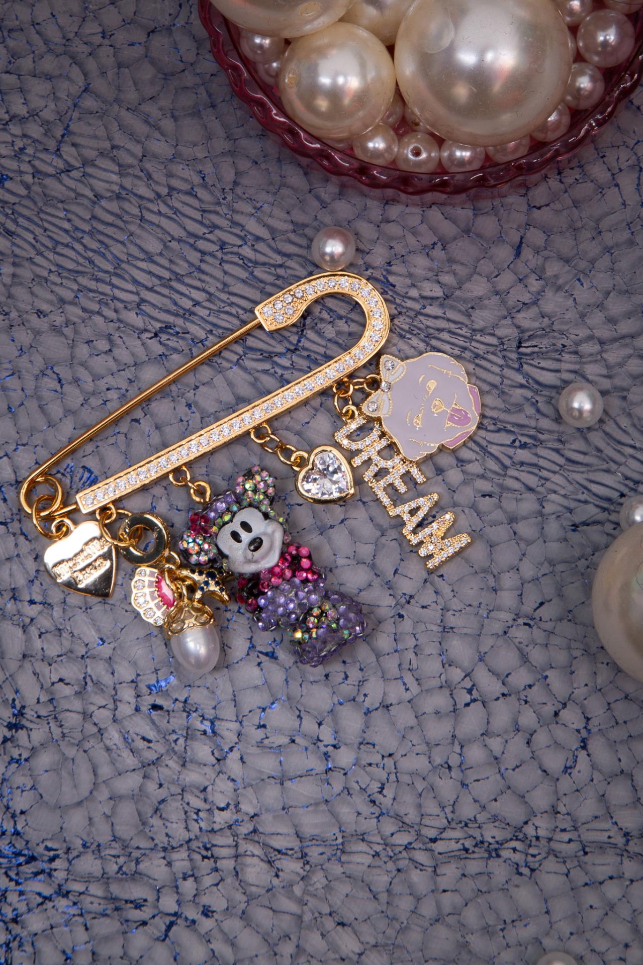 A gold safety pin brooch decorated with crystals and playful Dream themed charms.