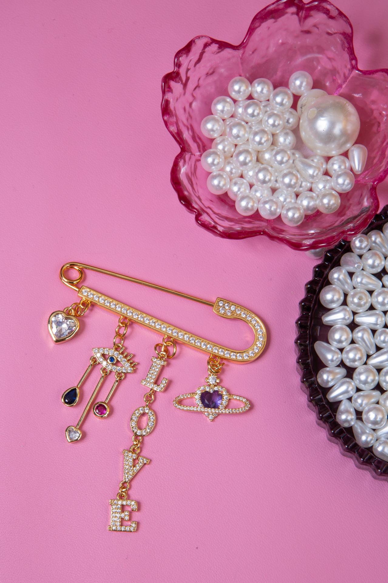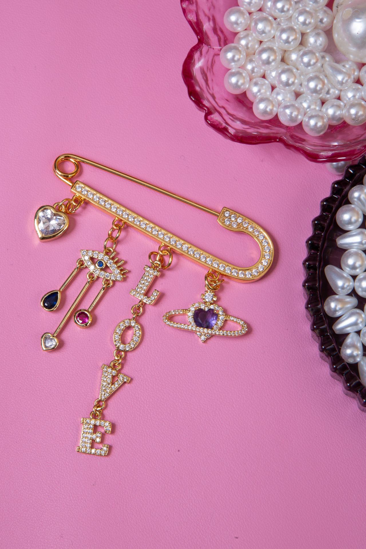 A gold safety pin brooch decorated with sparkling charms including a heart, an eye, crystal letters, and a gemstone planet.