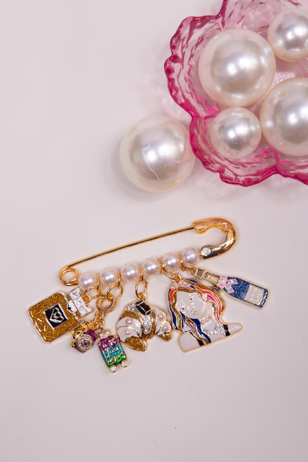 A gold safety pin brooch decorated with pearl beads and colorful charms inspired by perfume, pastries, fashion, and celebration.
