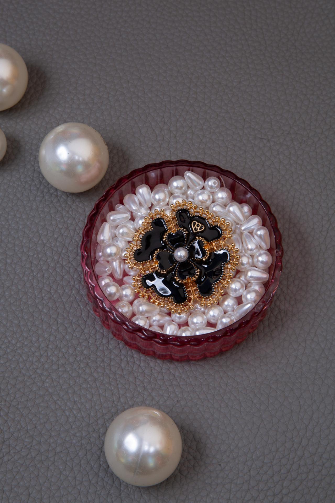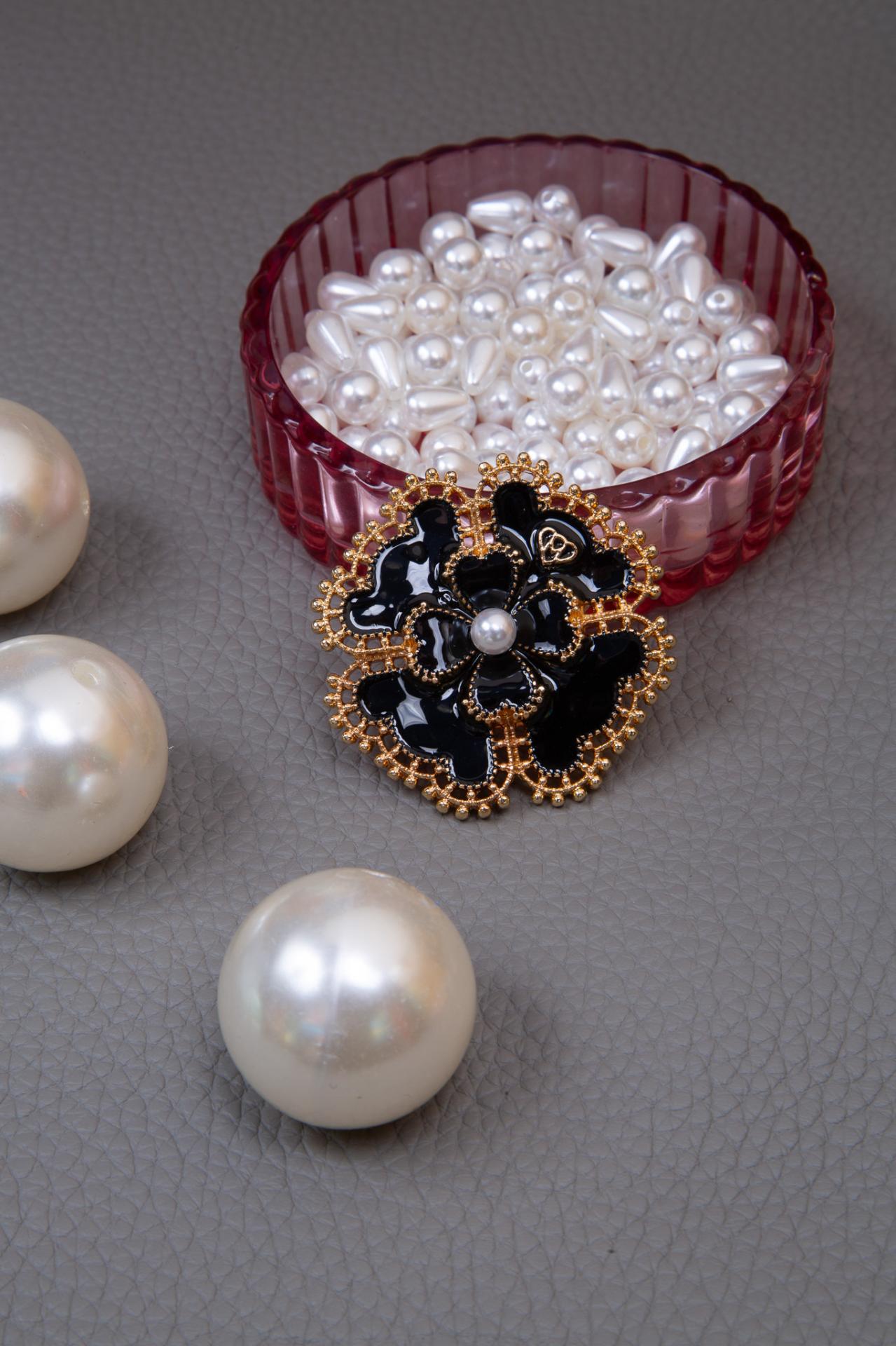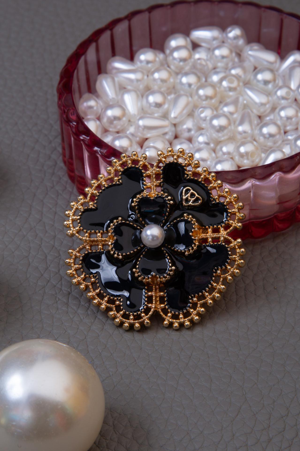 A black and gold floral brooch with beaded details and a luminous central pearl.