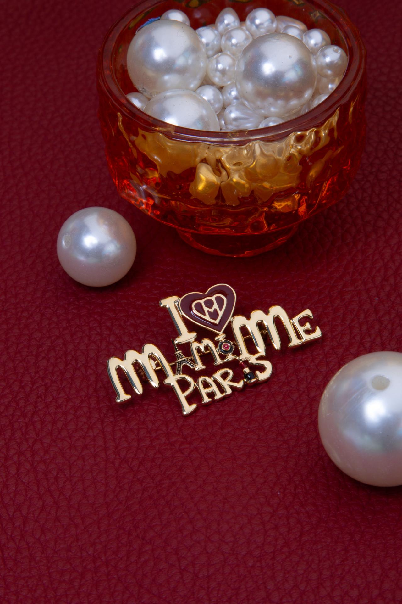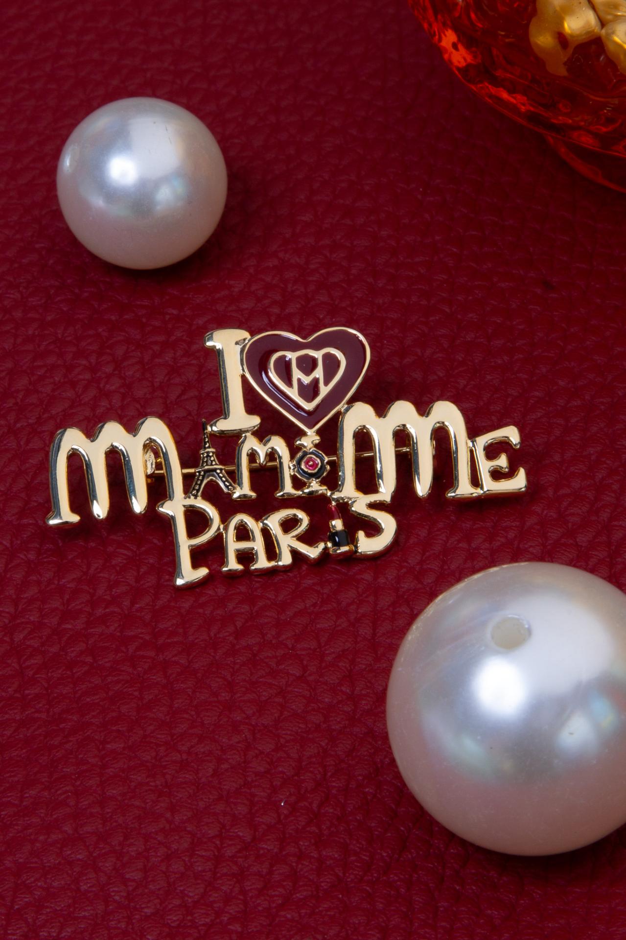 A gold statement brooch with enamel details spelling “I Love MiniMe Paris” with a heart and tiny Paris accents.