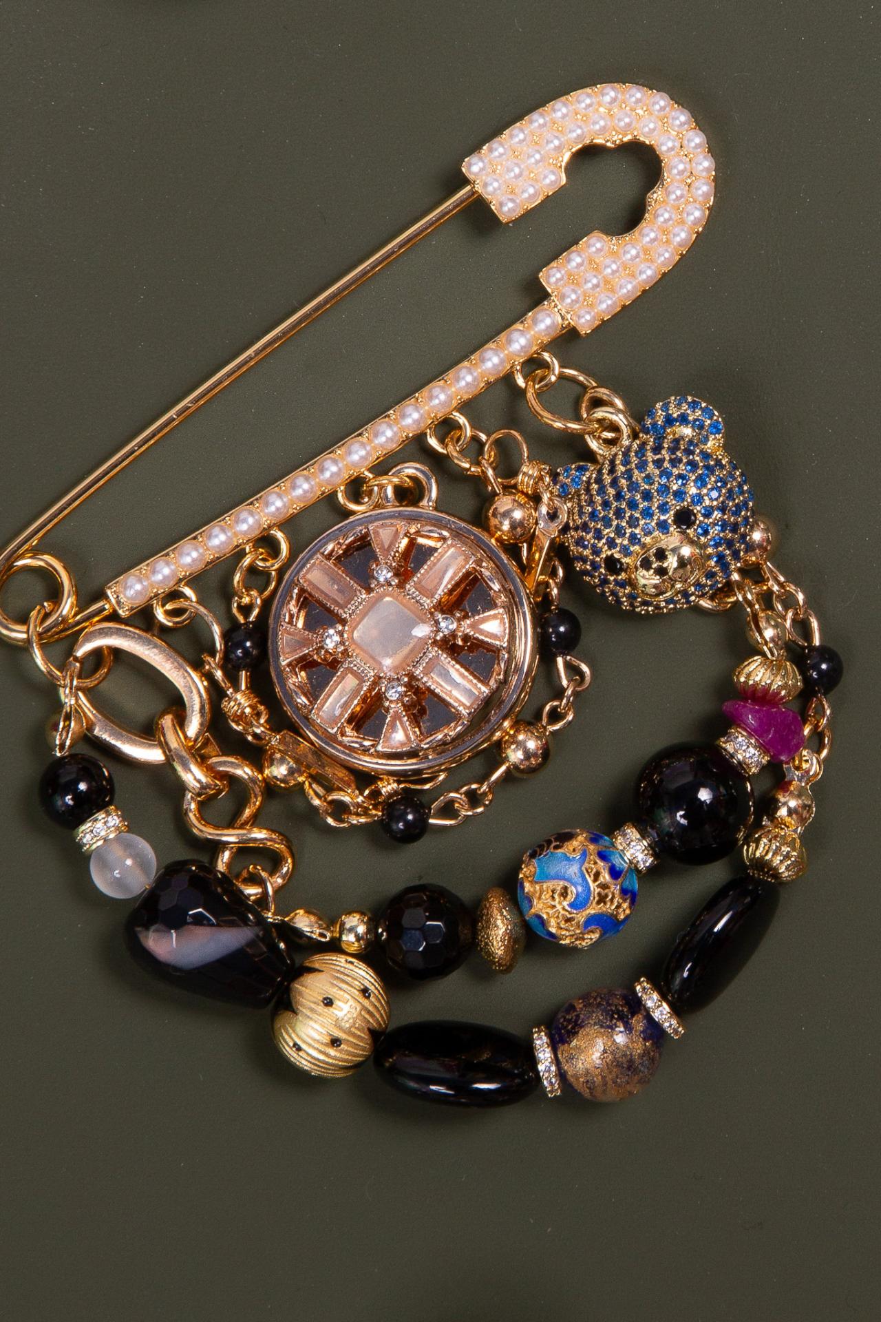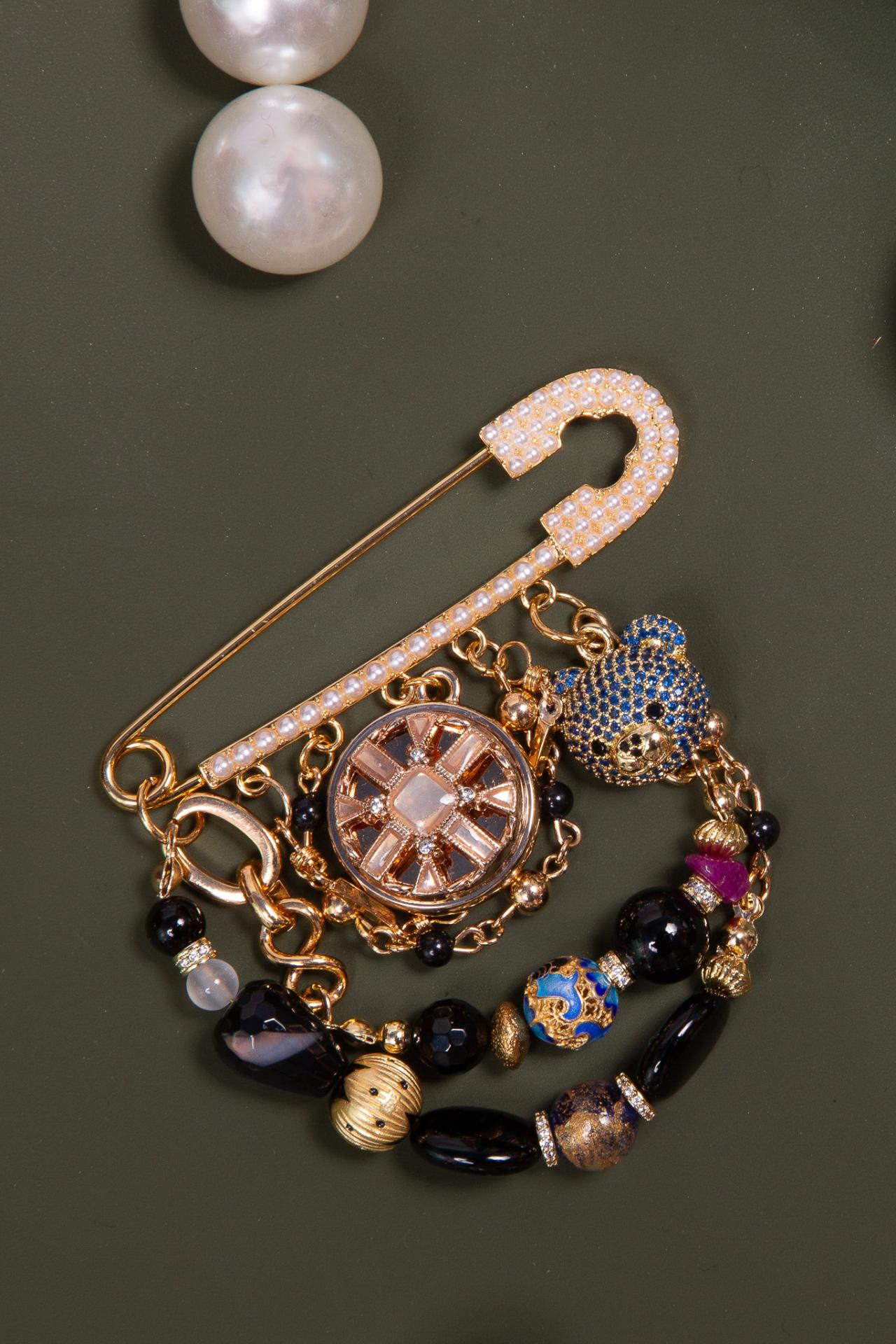 A gold safety pin brooch decorated with black and gold beads, a jeweled medallion, and a sparkling blue bear charm.