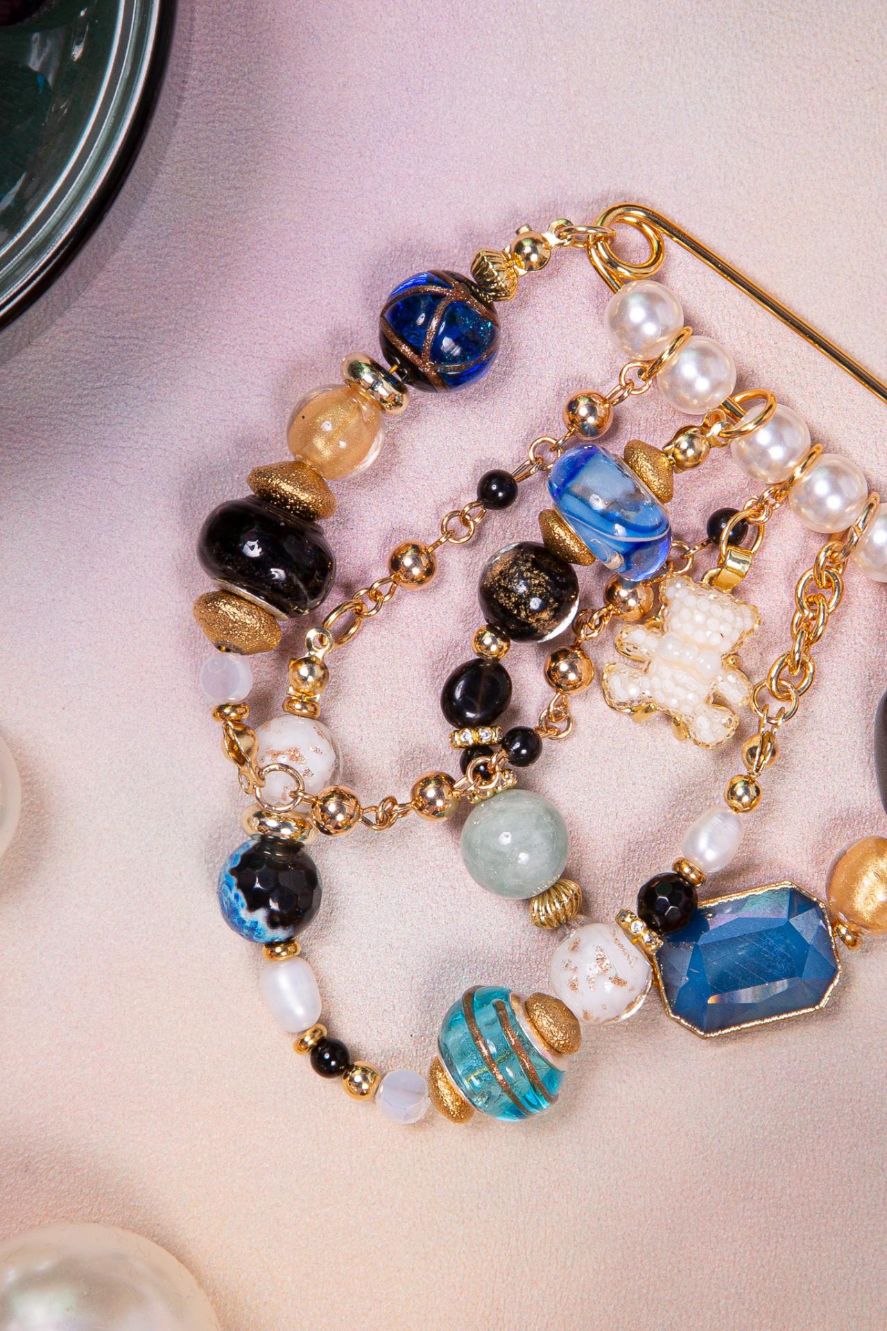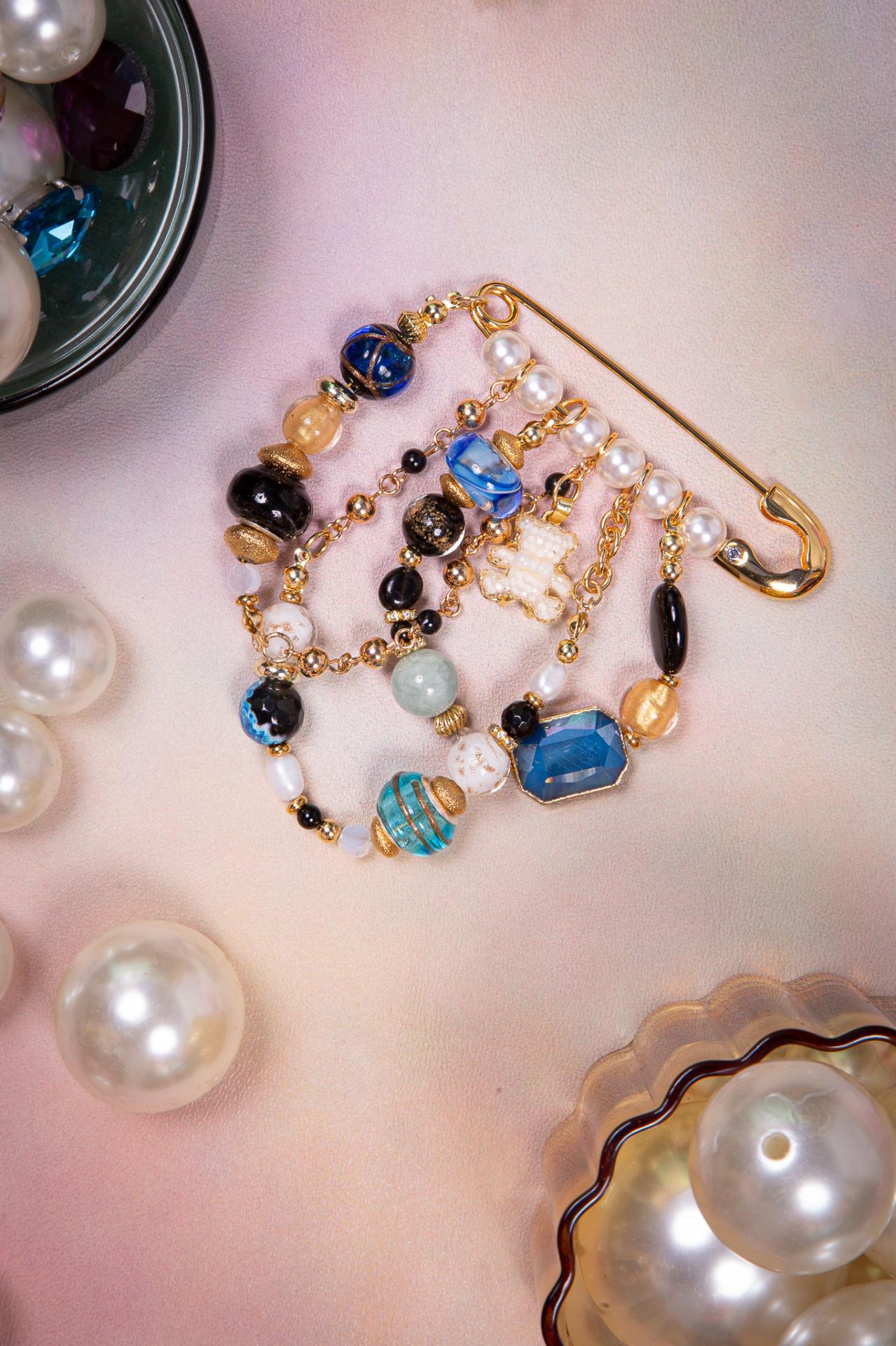 A gold safety pin brooch decorated with blue and black beads, pearls, and a small white bear charm.