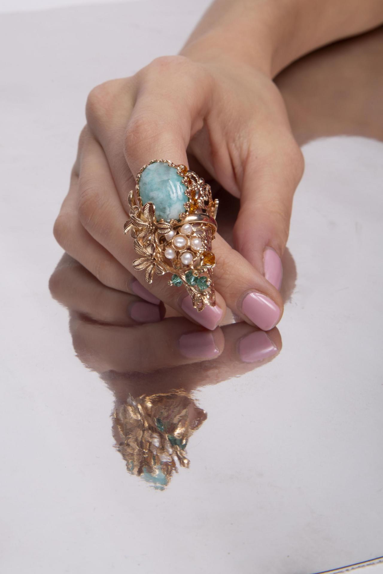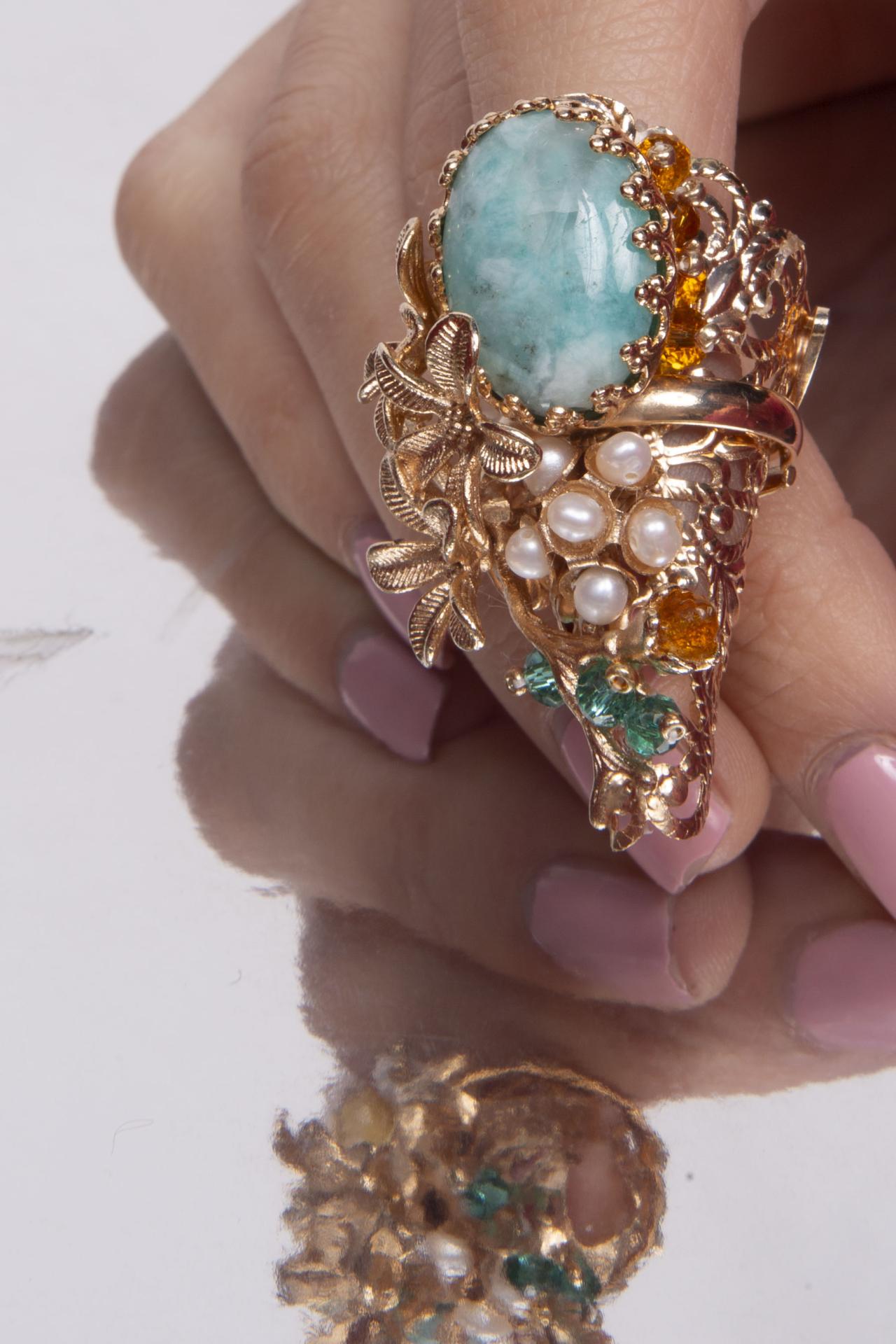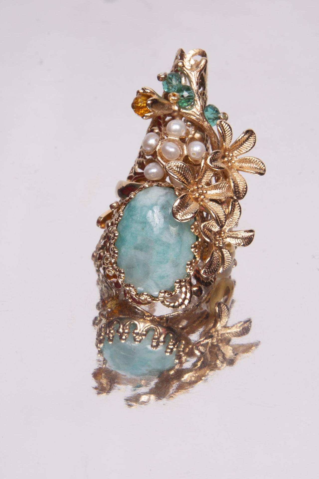 A gold nail accessory with an aqua stone, floral details, and pearl accents.
