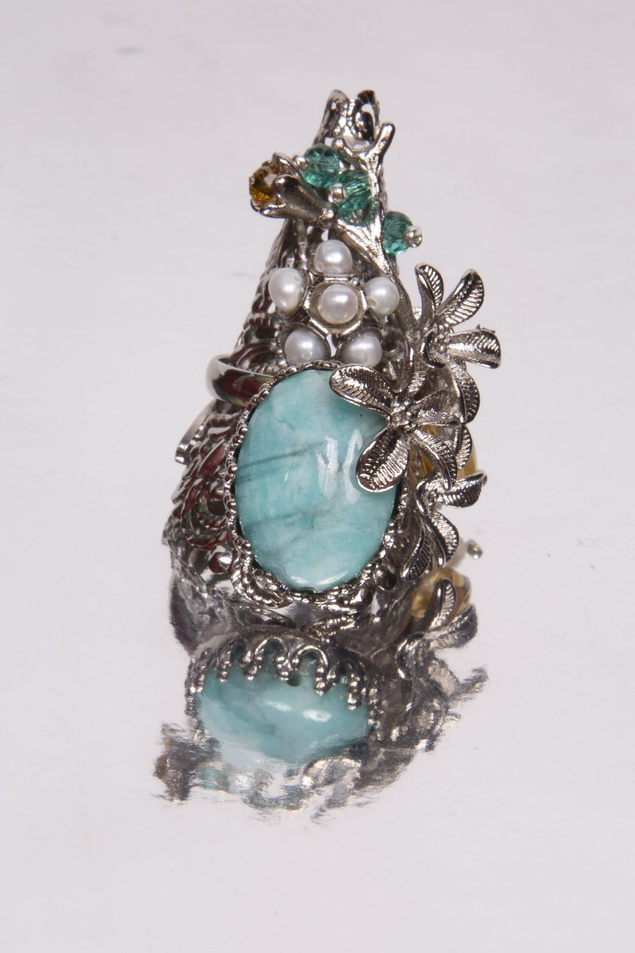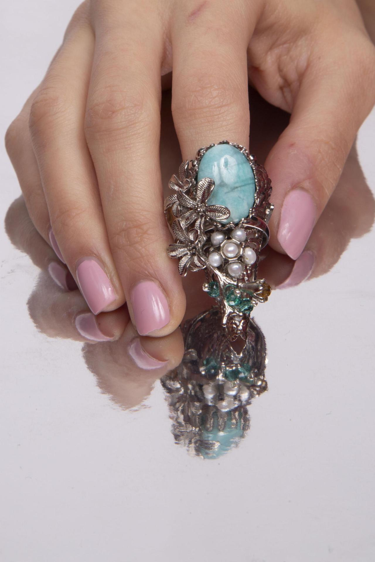 A silver nail accessory with an aqua stone, floral details, and pearl accents.