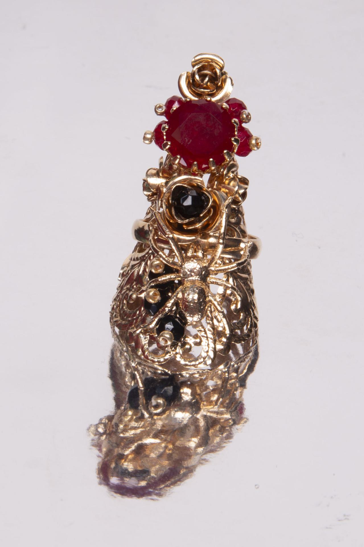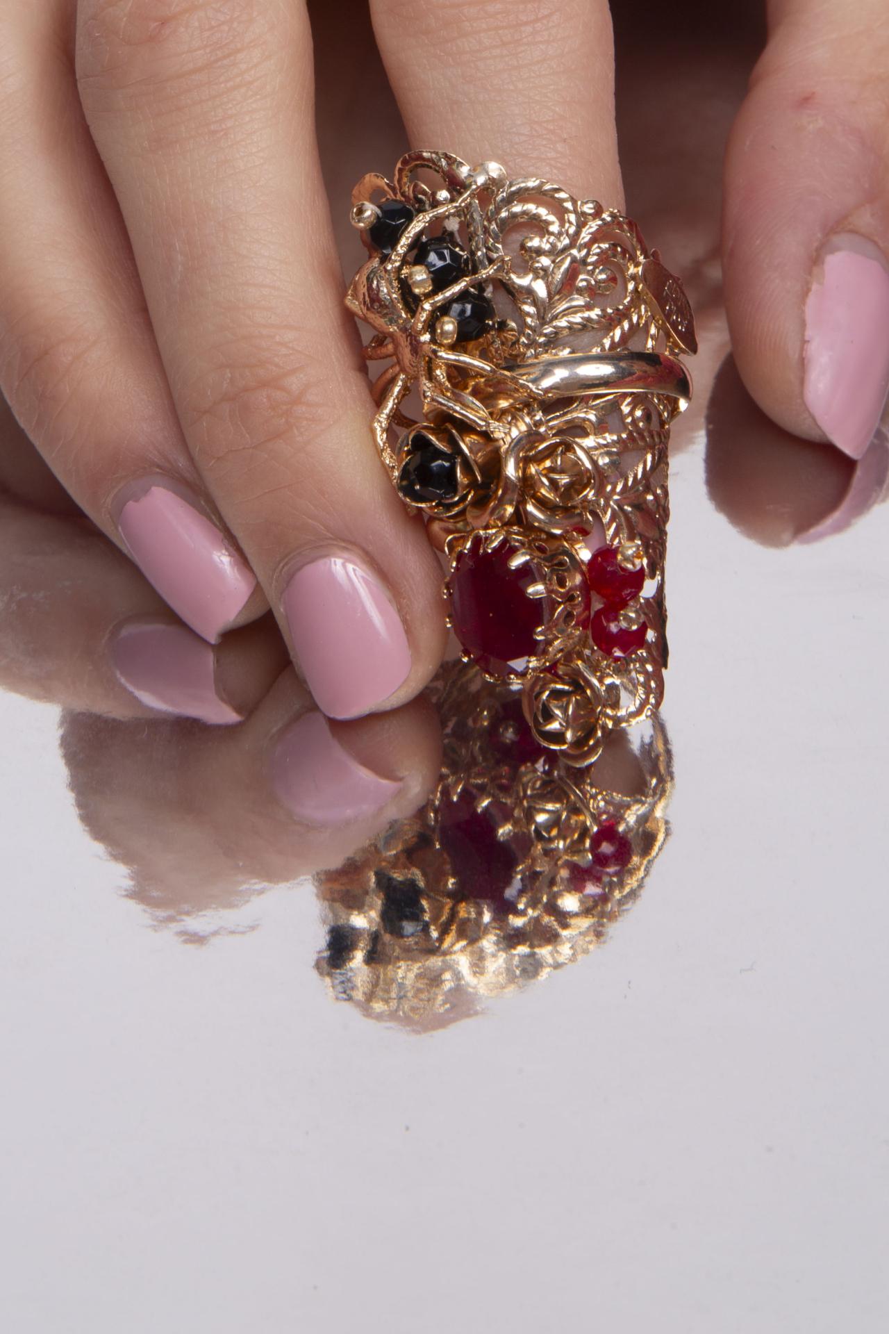 A gold nail accessory with ruby red stones, black accents, and ornate details.