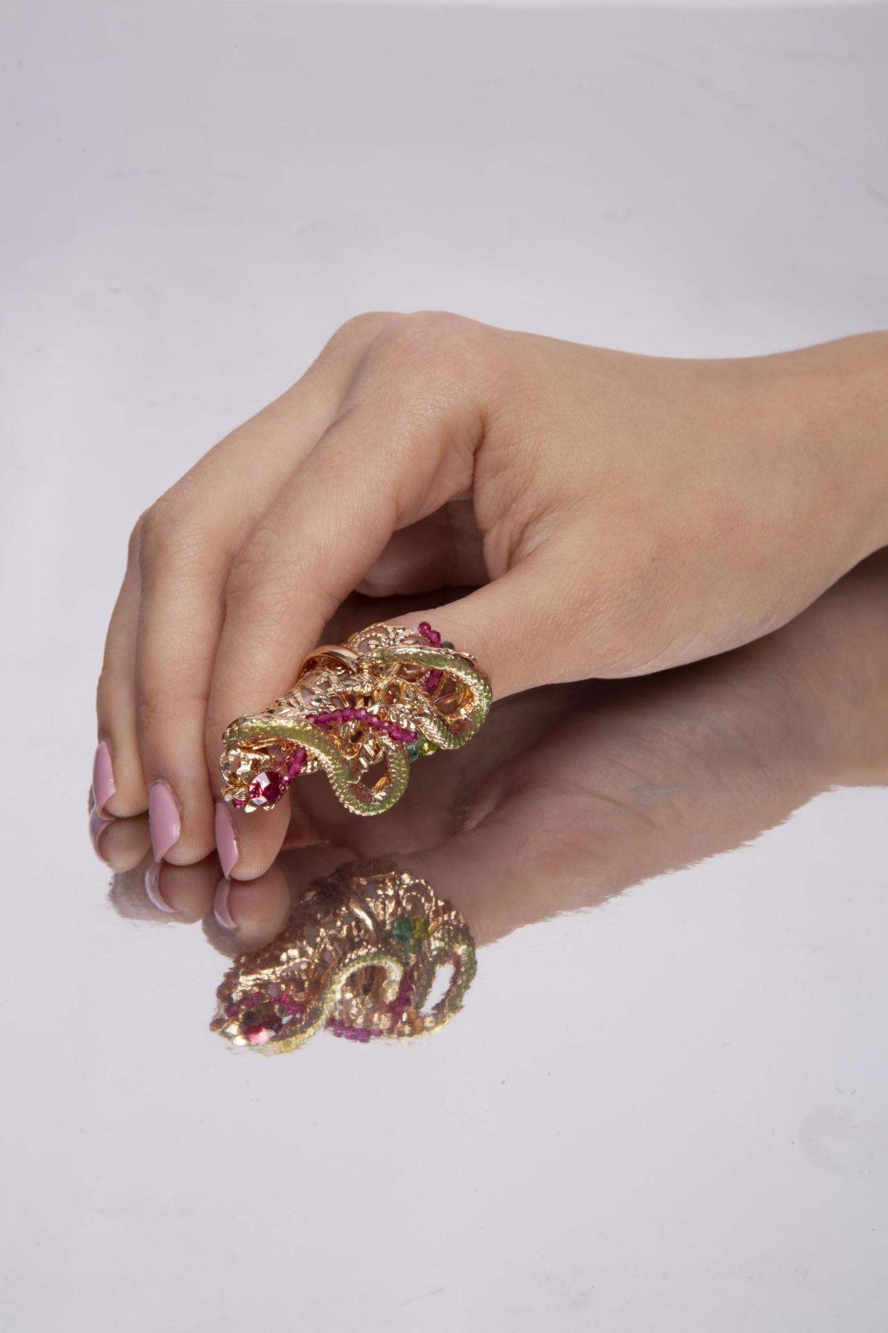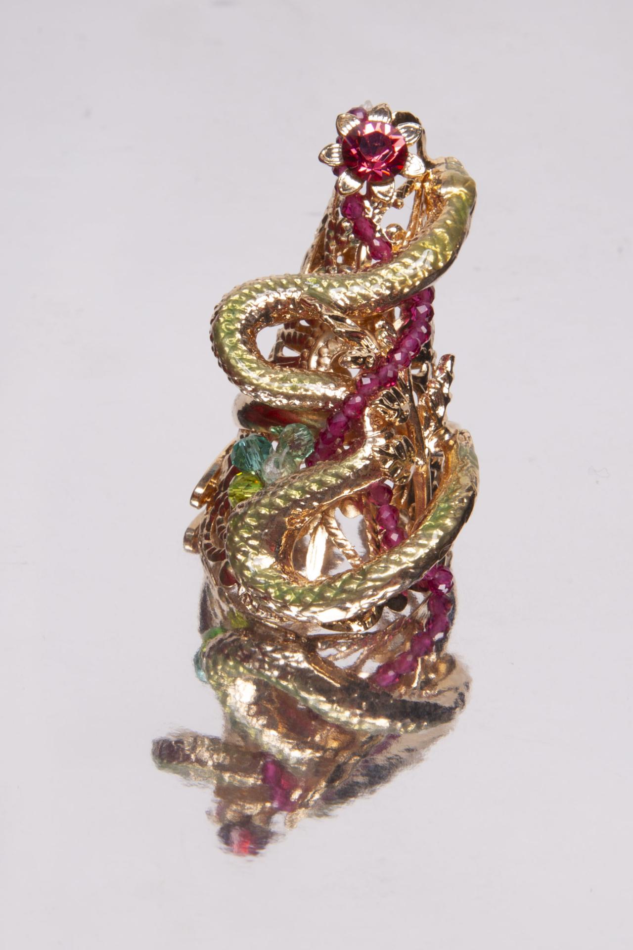 A gold nail accessory with a coiled serpent shape and pink crystal accents.