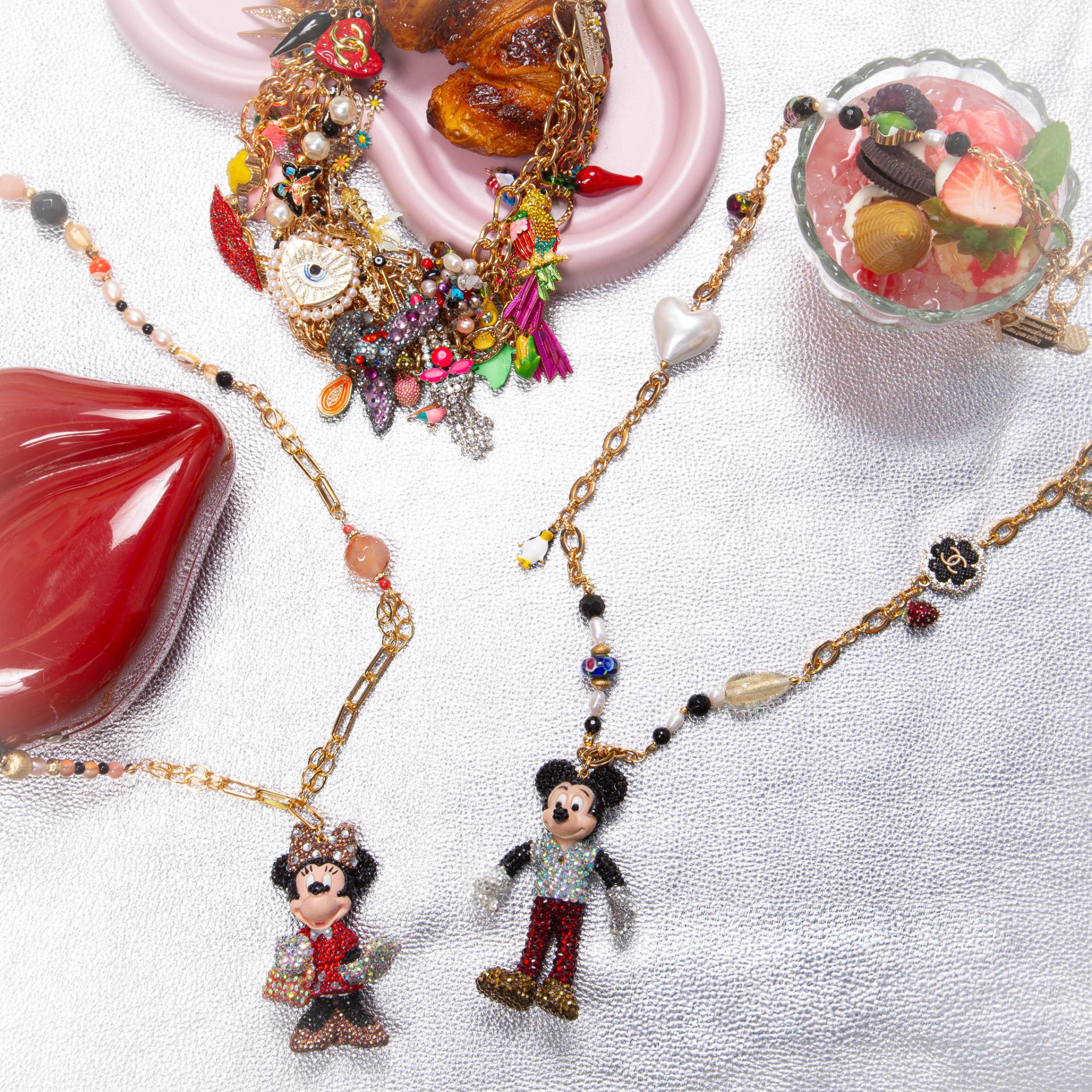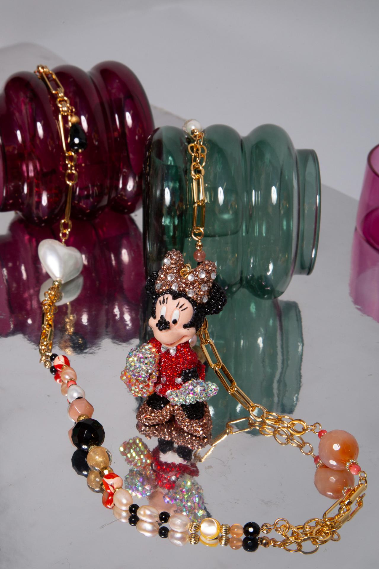 A stainless steel and enameled necklace with natural stones, pearls and a sparkling character charm with a crystal bow.