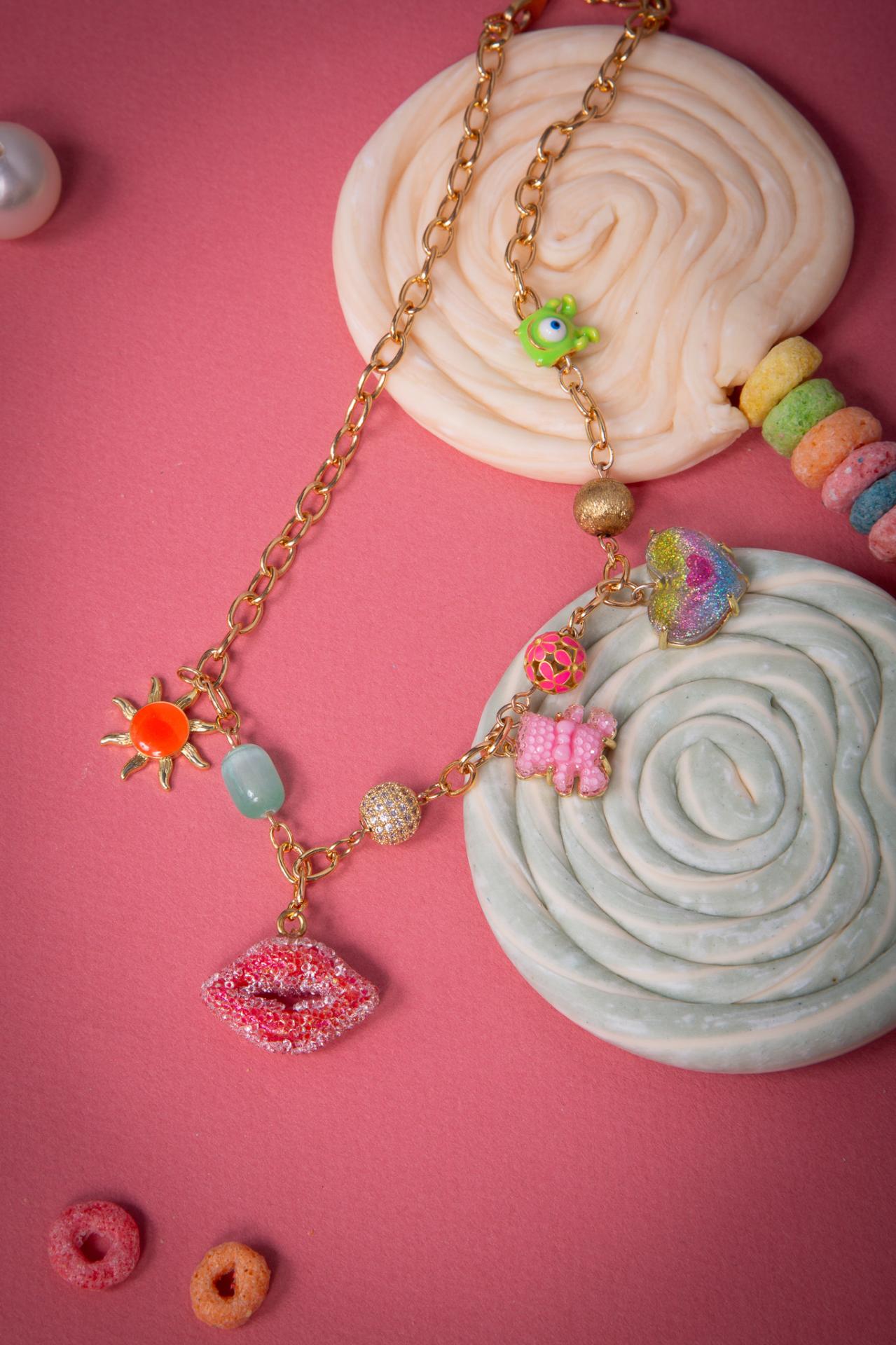 A stainless steel and enameled necklace with stones pearls and playful charms, finished with sparkling pink lips. Crafted using upcycled and recycled materials, this necklace reflects MiniMe Paris’s commitment to creativity and conscious fashion.