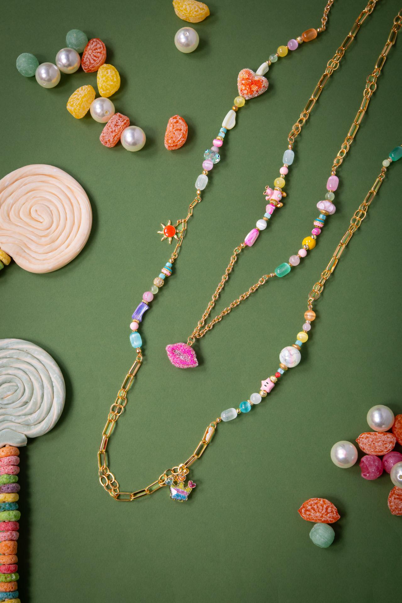 A stainless steel and enameled necklace with natural stones pearls colorful charms and a sparkling kiss pendant in the center.