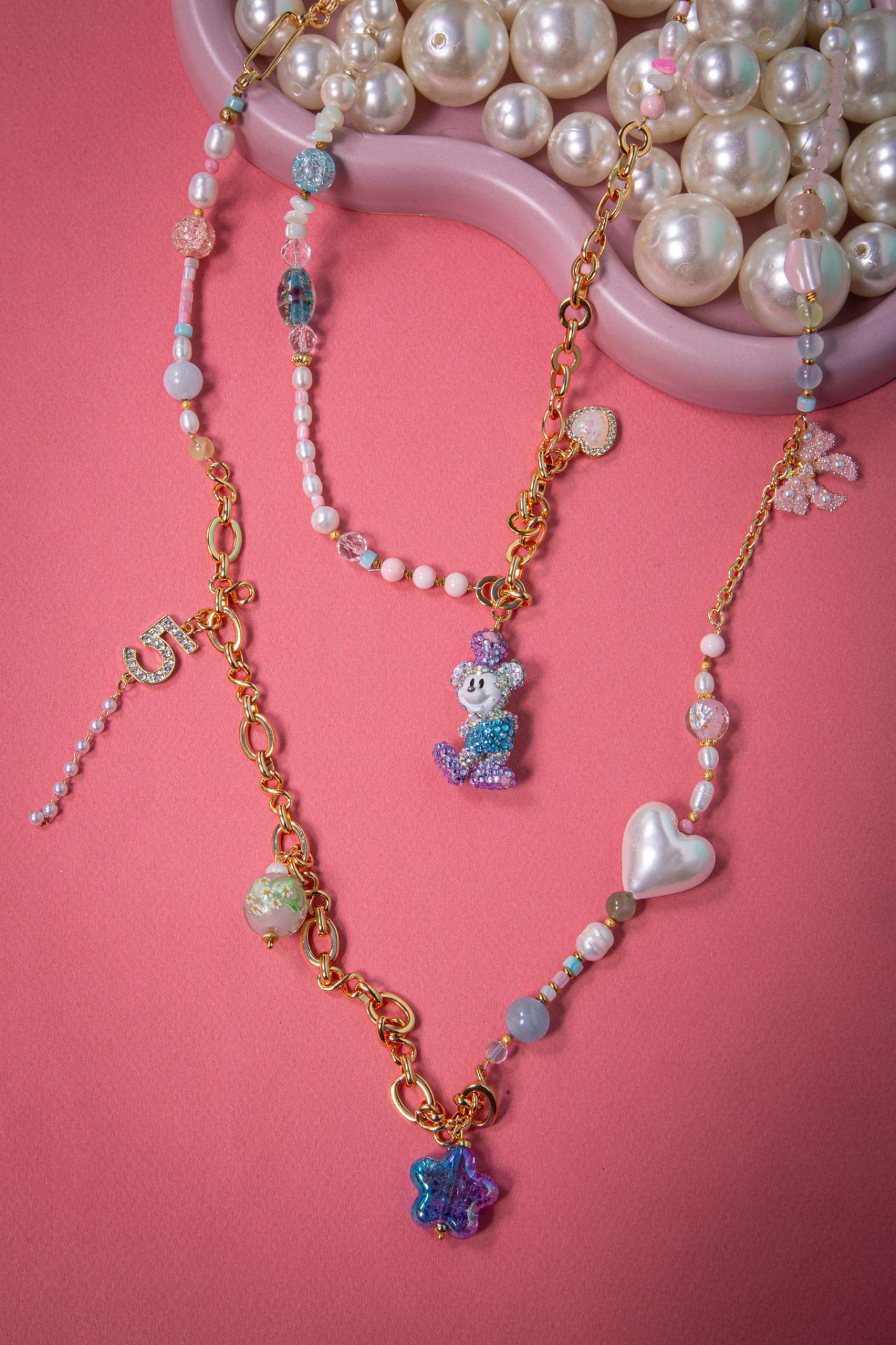 A stainless steel and enameled necklace with pearls stones and pastel charms, finished with a sparkling purple mouse pendant. Crafted using upcycled and recycled materials, this necklace reflects MiniMe Paris’s commitment to creativity and conscious fashion.