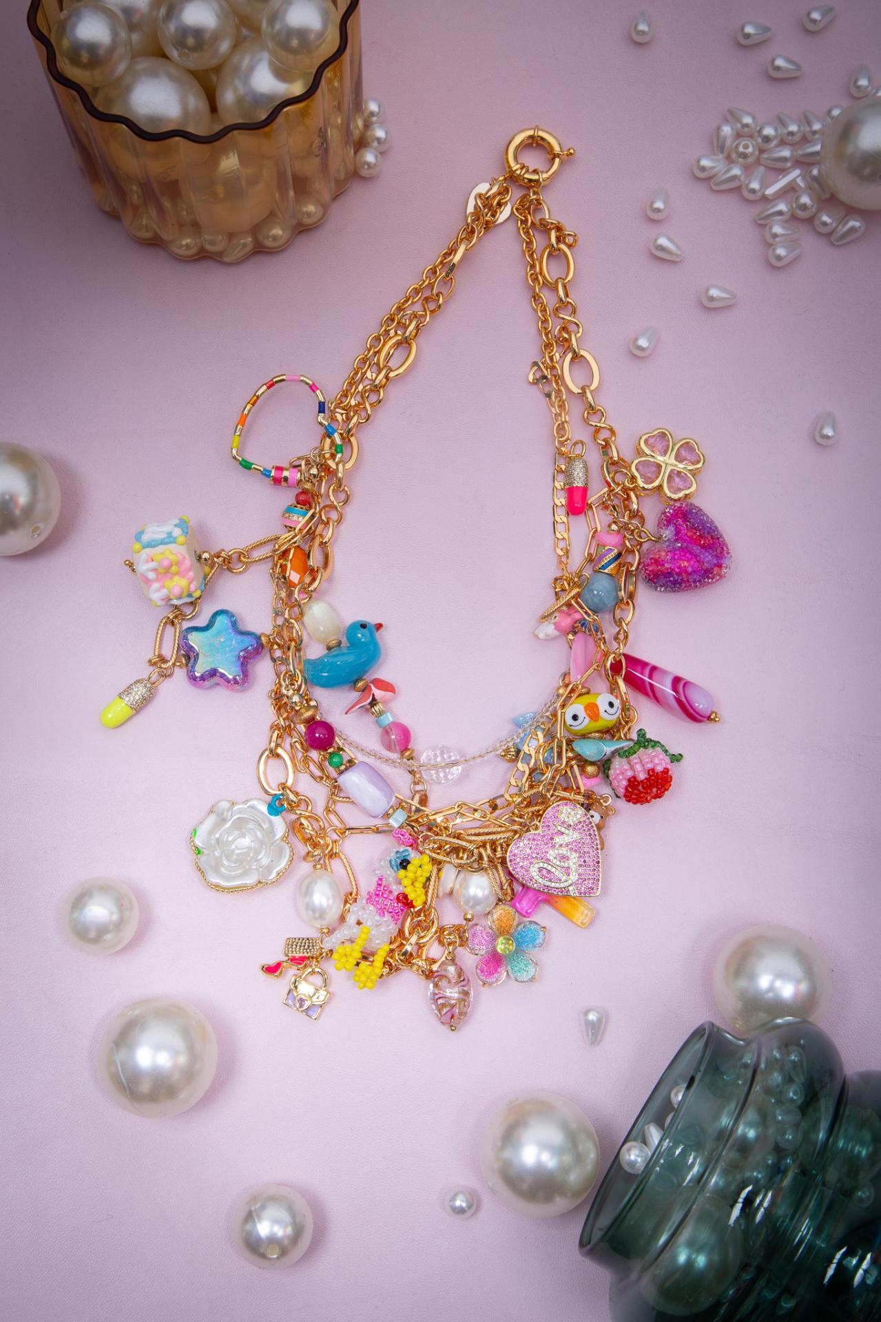 A stainless steel and enameled necklace with natural stones, pearls and a vibrant mix of colorful charms.