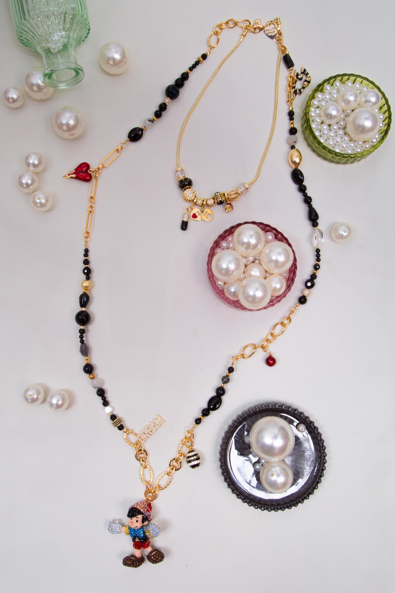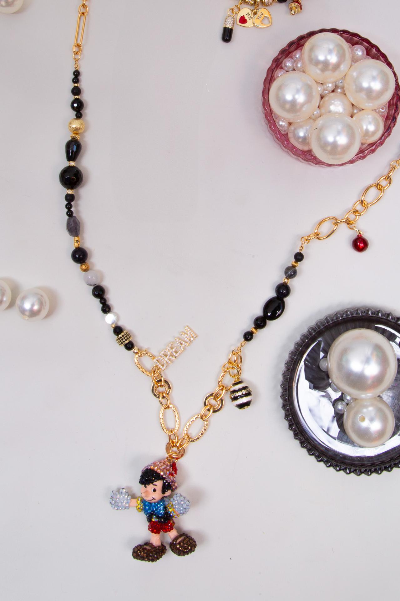 A stainless steel and enameled necklace with natural stones, pearls and a beaded puppet charm.