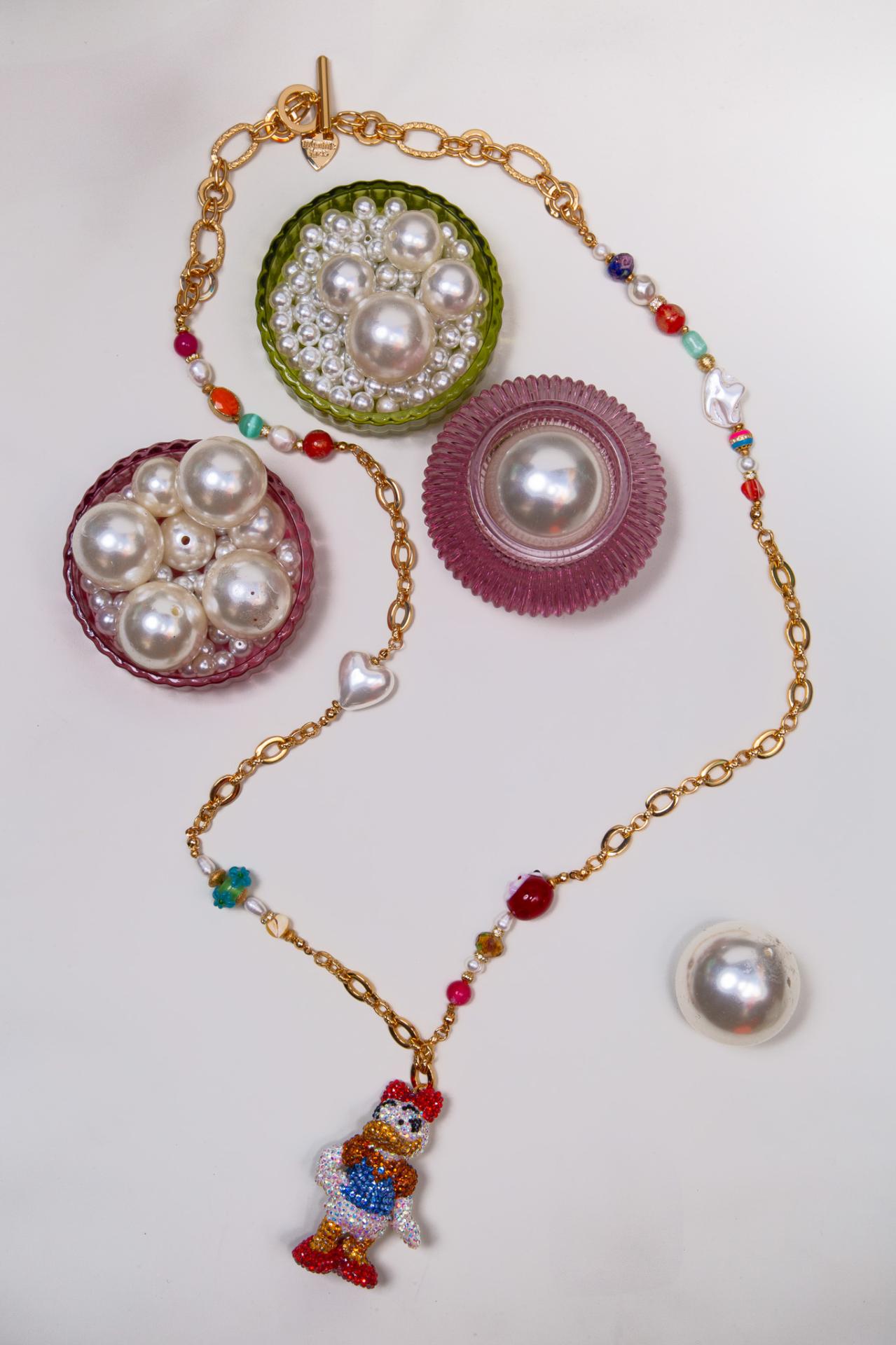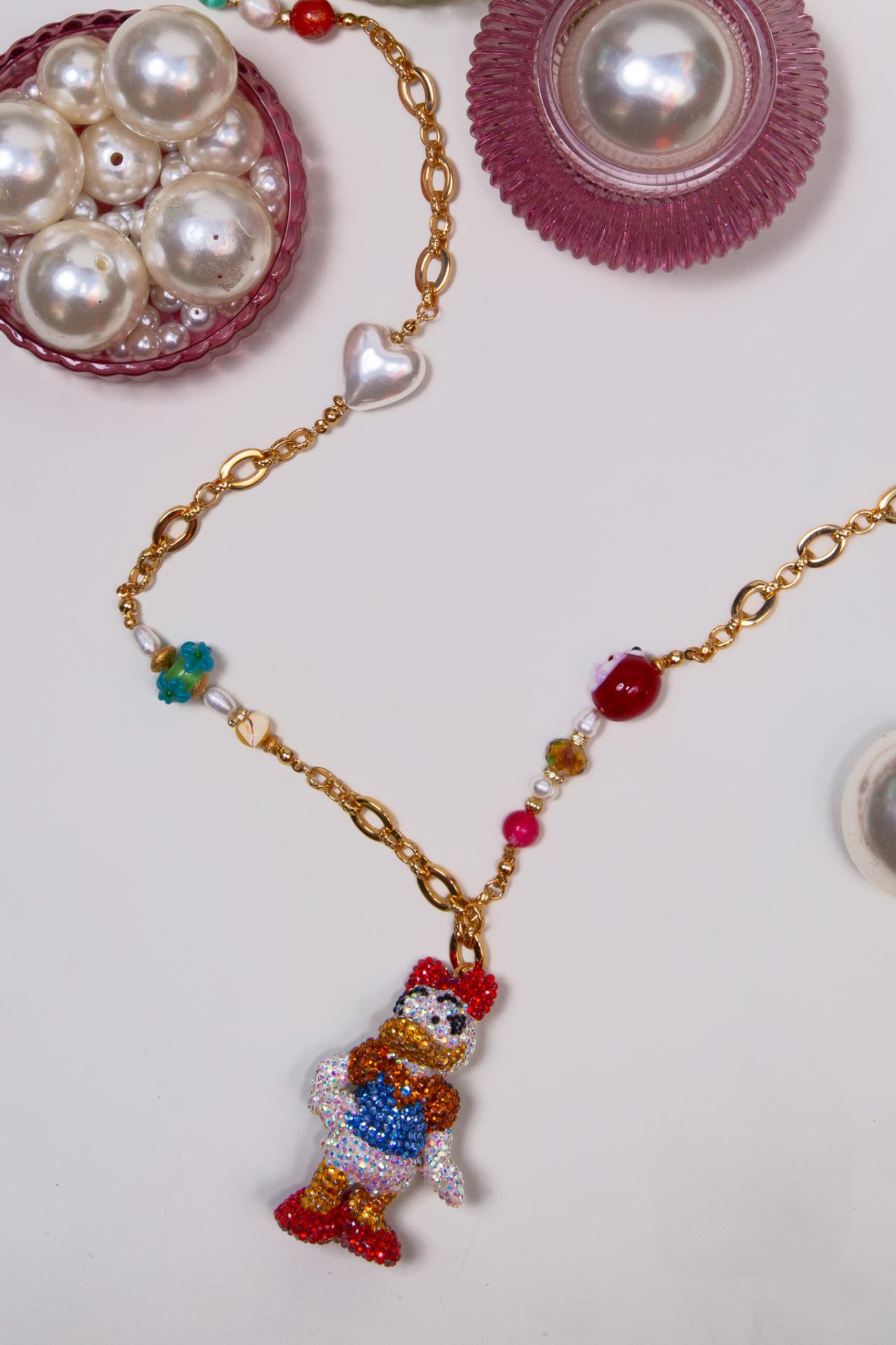 A stainless steel and enameled necklace with natural stones, pearls and a crystal duck charm.