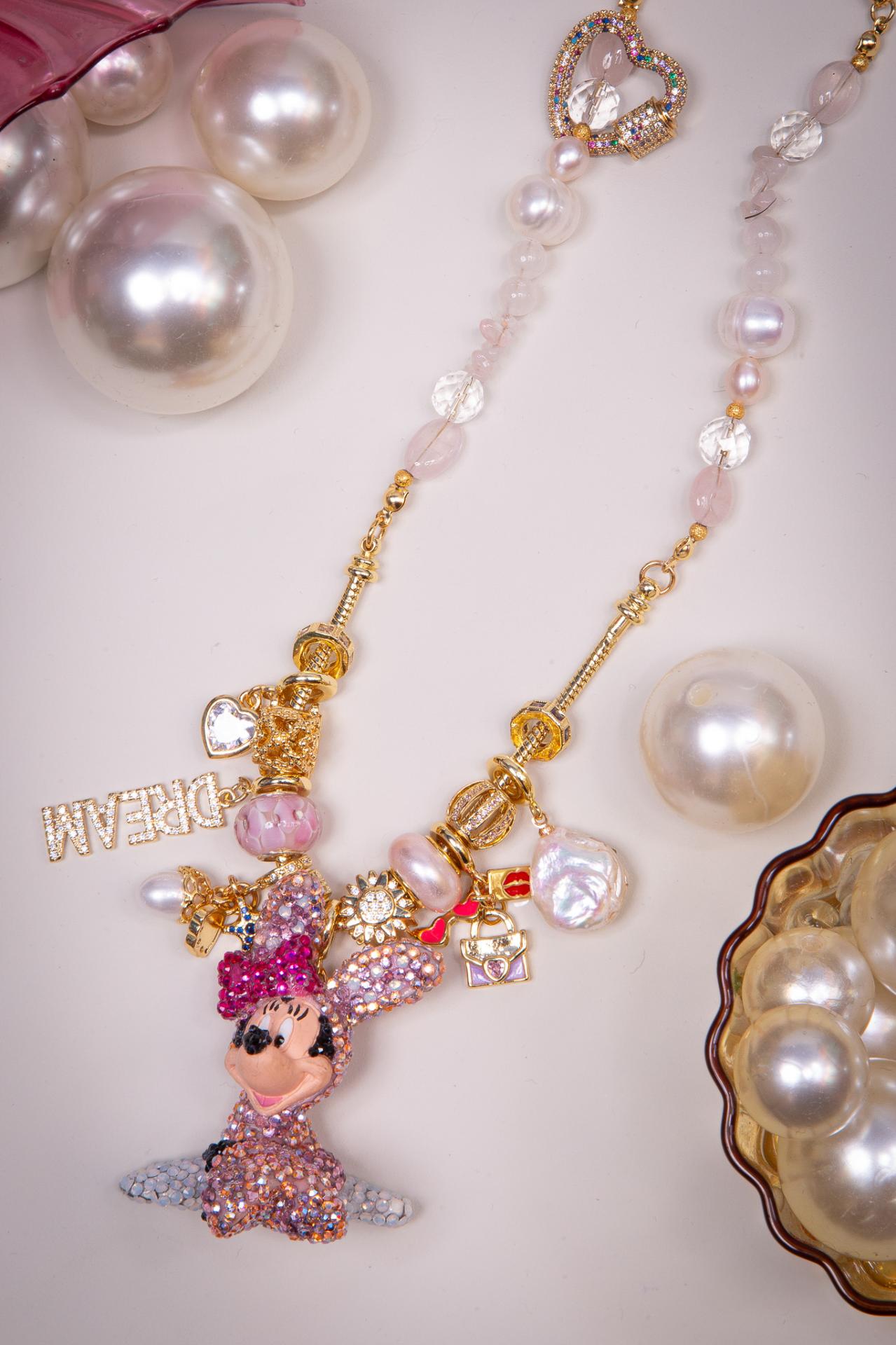 A stainless steel and enameled necklace with pearls stones and assorted charms, finished with a sparkling crystal mouse pendant in pink. Crafted using upcycled and recycled materials, this necklace reflects MiniMe Paris’s commitment to creativity and conscious fashion.