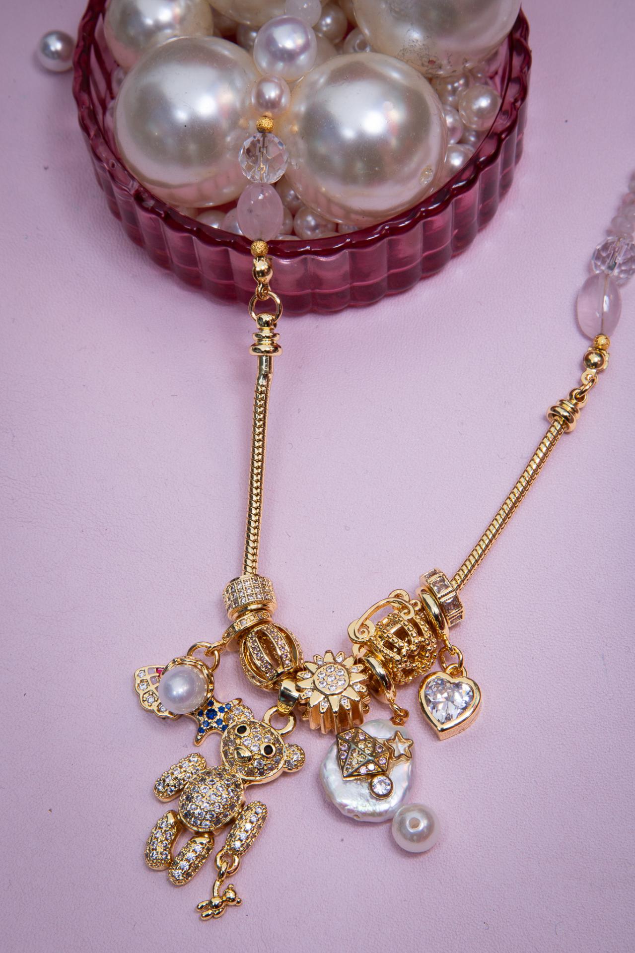 A stainless steel and enameled necklace with pearls stones and golden charms, finished with a sparkling bear pendant. Crafted using upcycled and recycled materials, this necklace reflects MiniMe Paris’s commitment to creativity and conscious fashion.