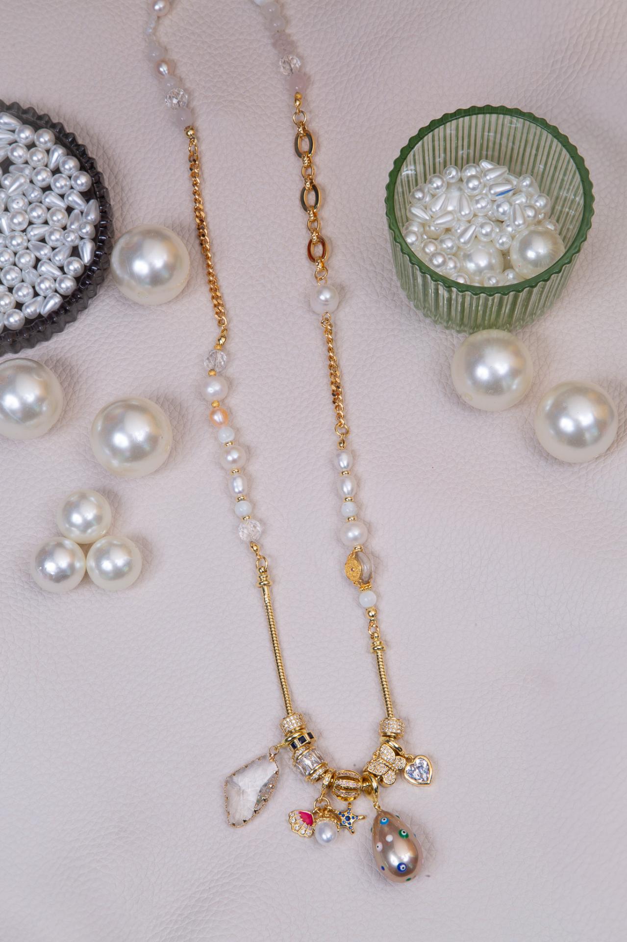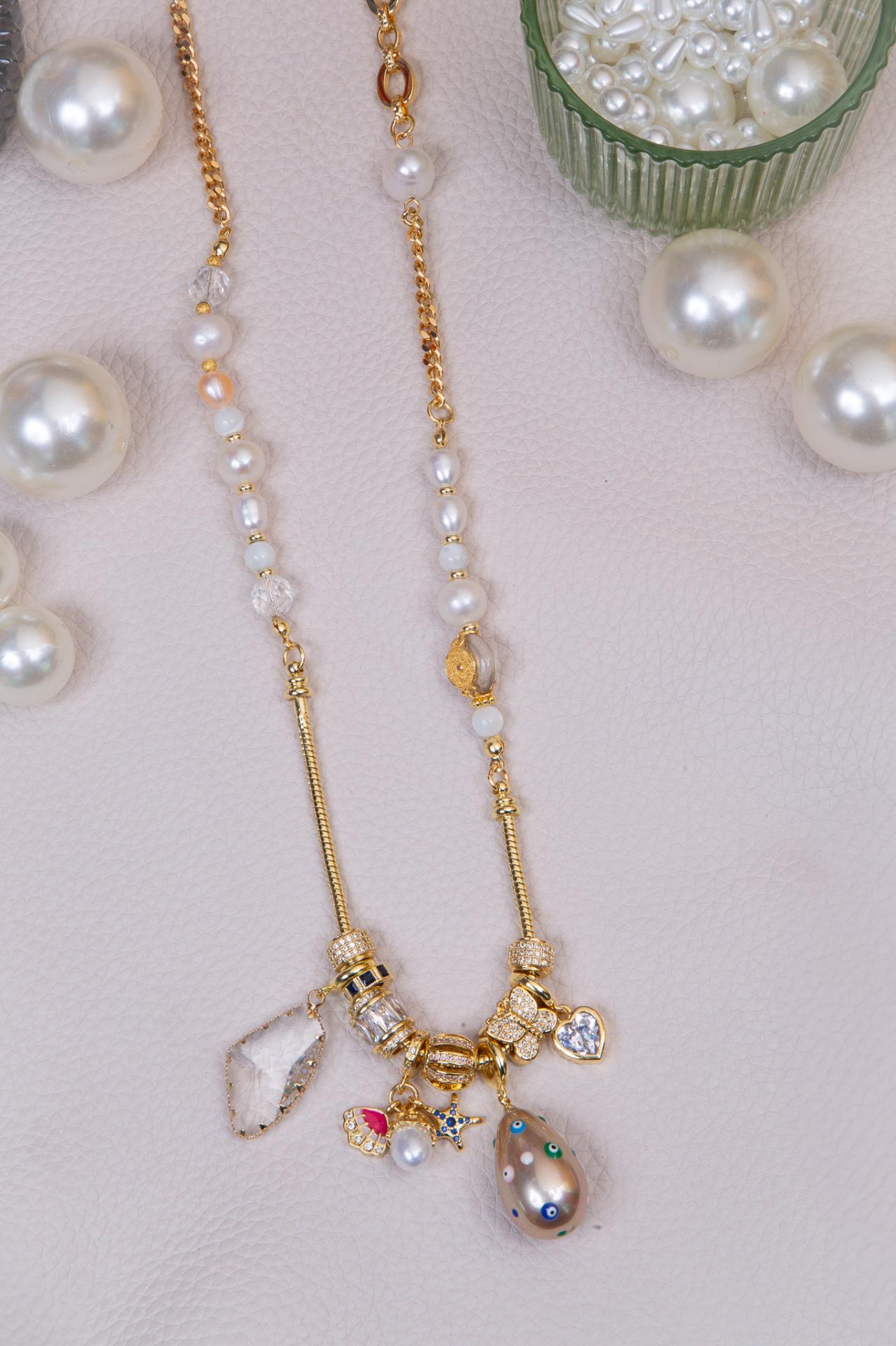 A stainless steel and enameled necklace with pearls stones and golden charms, highlighted by a large teardrop pendant. Crafted using upcycled and recycled materials, this necklace reflects MiniMe Paris’s commitment to creativity and conscious fashion.
