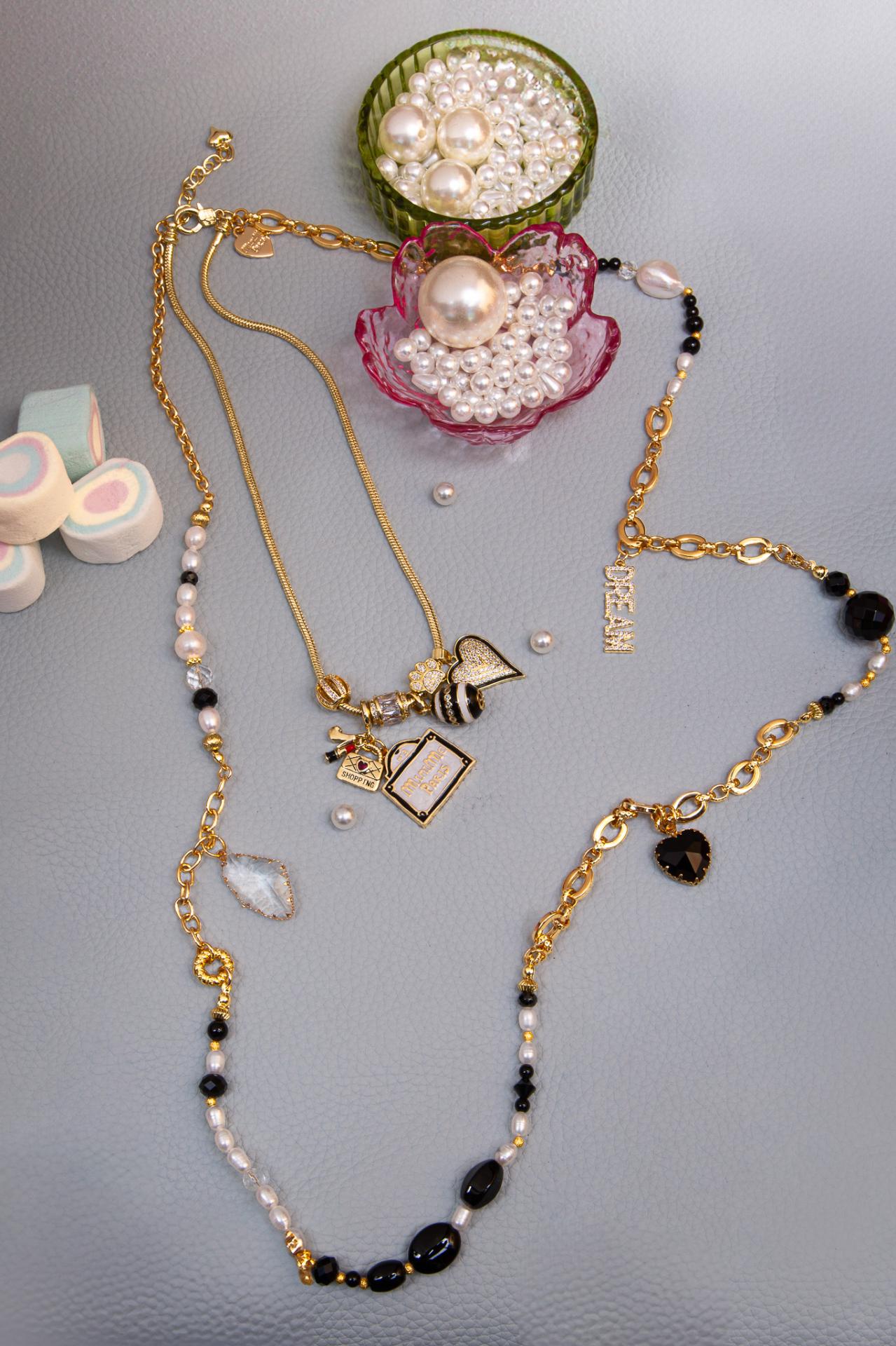 A stainless steel and enameled necklace with pearls stones and decorative charms, finished with black hearts and a DREAM motif. Crafted using upcycled and recycled materials, this necklace reflects MiniMe Paris’s commitment to creativity and conscious fashion.