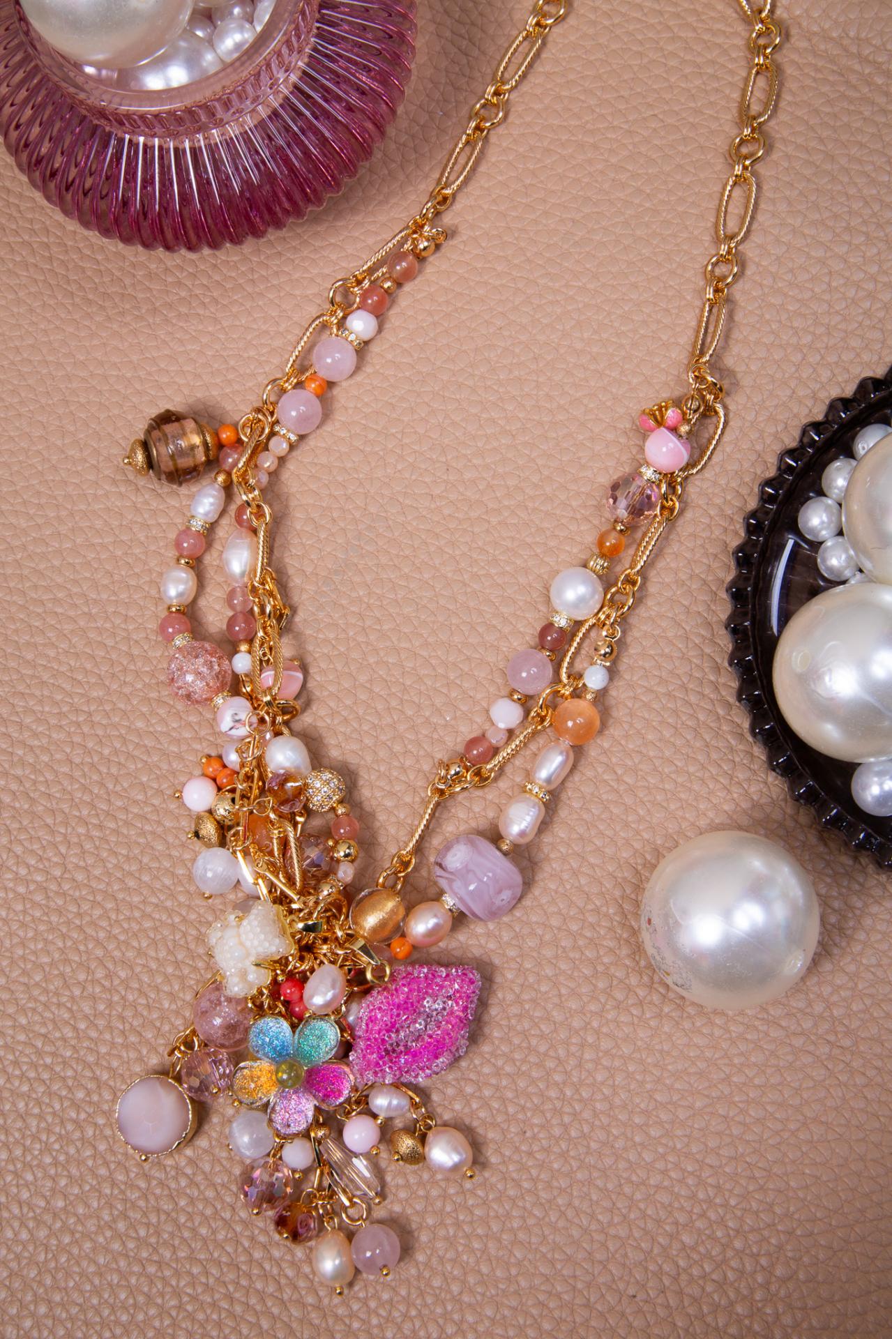 A stainless steel and enameled necklace with pearls stones and soft pastel charms, highlighted by a sparkling pink flower and glitter leaf. Crafted using upcycled and recycled materials, this necklace reflects MiniMe Paris’s commitment to creativity and conscious fashion.