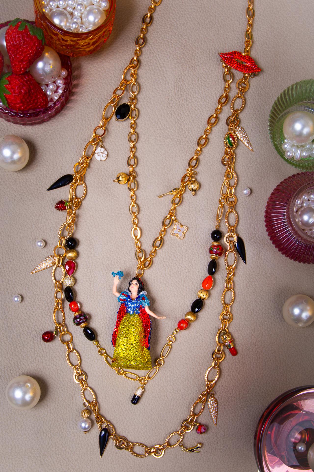 A stainless steel and enameled necklace with natural stones pearls and playful charms, centered around a hand sculpted fairytale girl pendant. Crafted using upcycled and recycled materials, this necklace reflects MiniMe Paris’s commitment to creativity and conscious fashion.