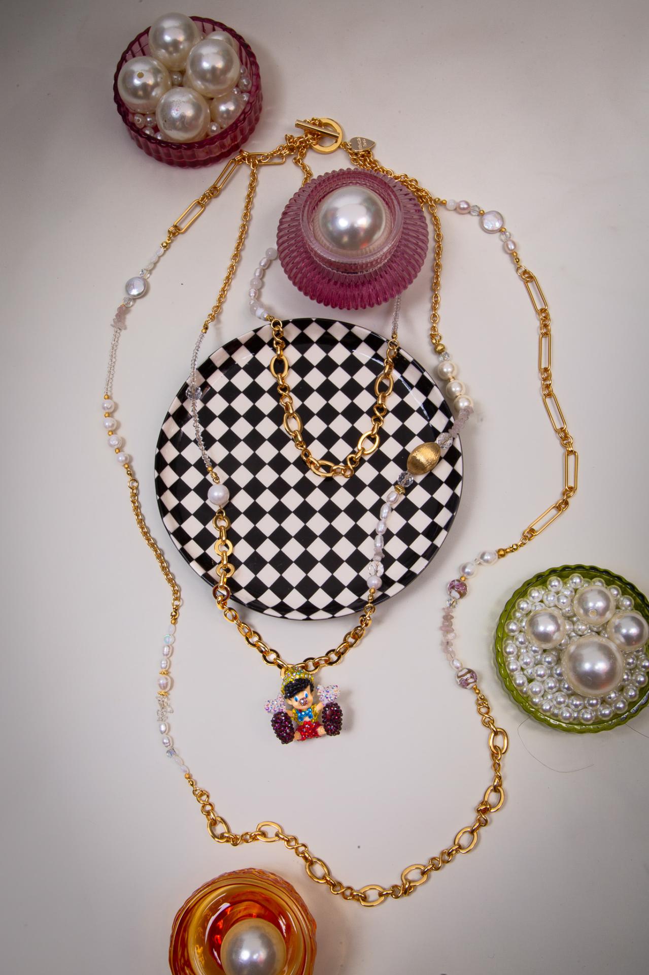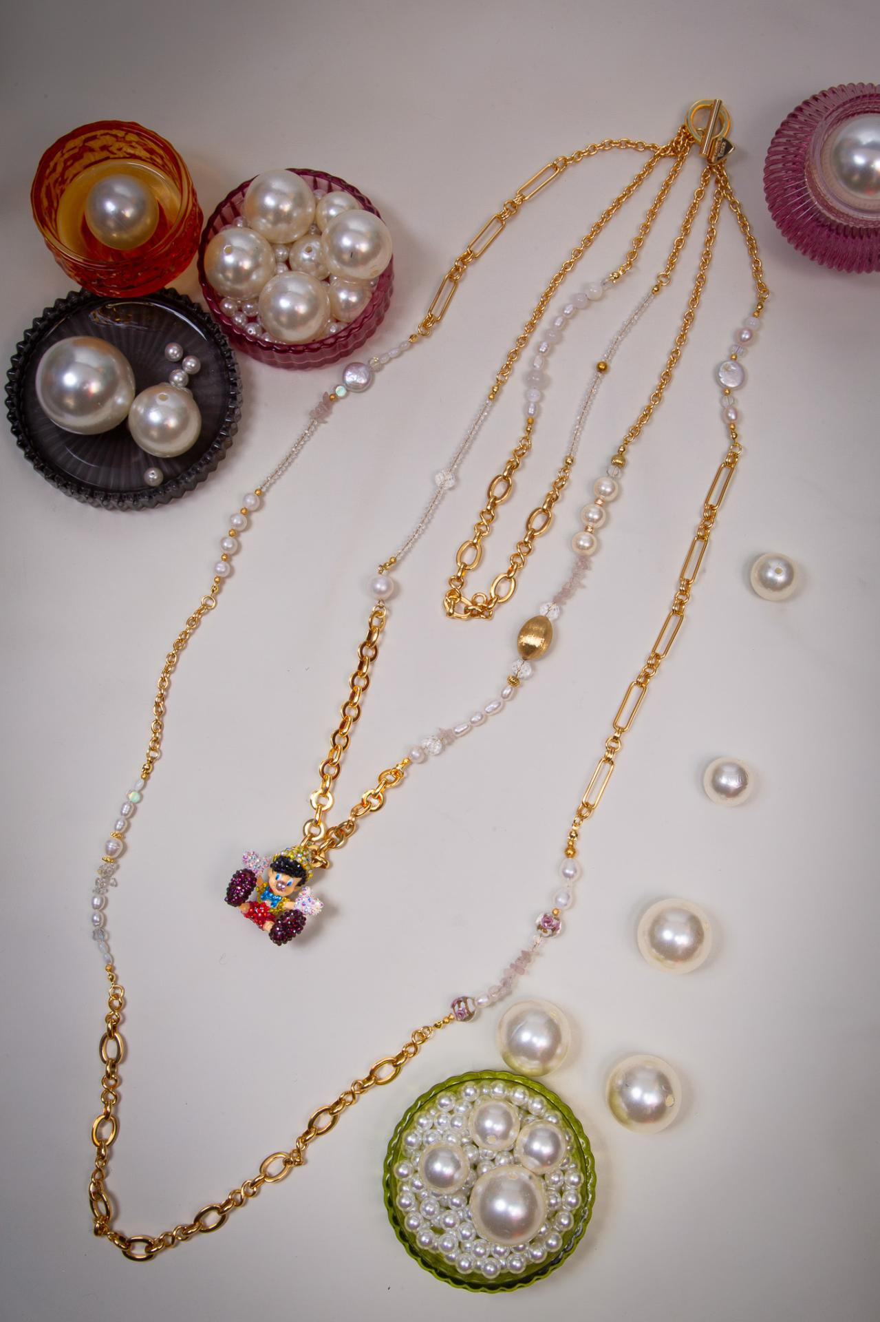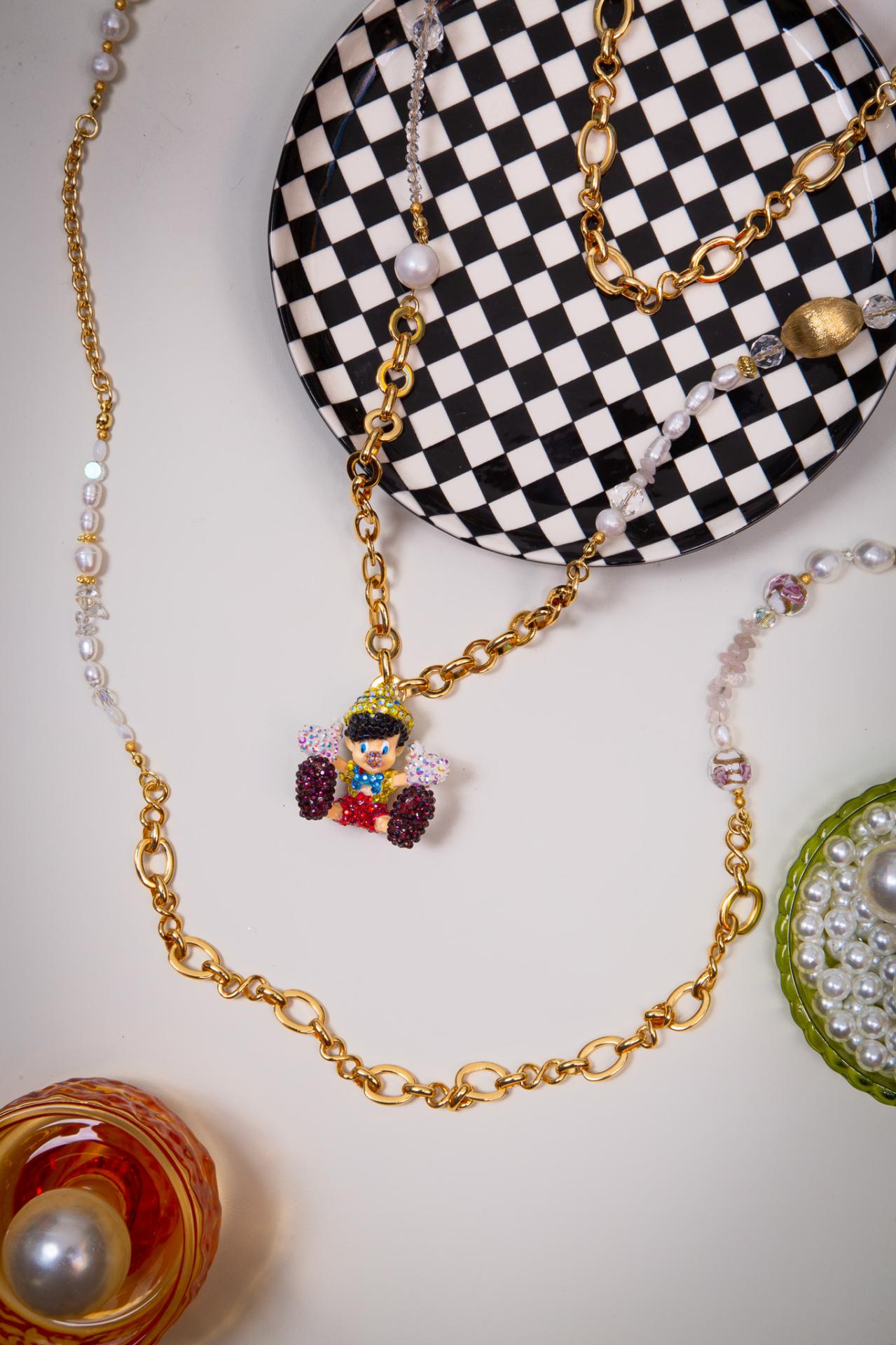 A stainless steel and enameled necklace with natural stones, pearls and a sparkling puppet charm, crafted using upcycled and recycled materials.