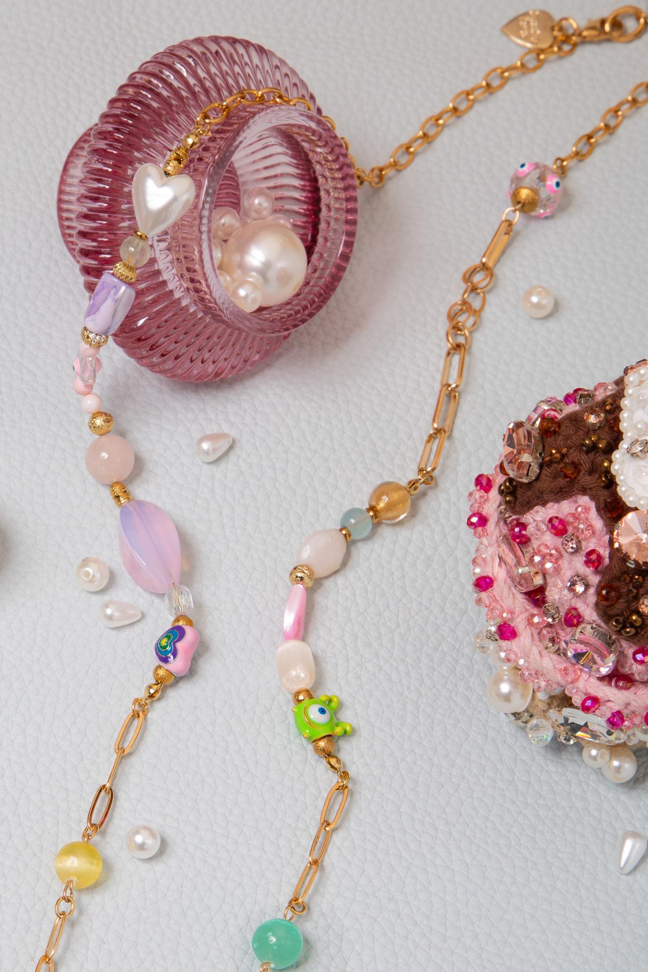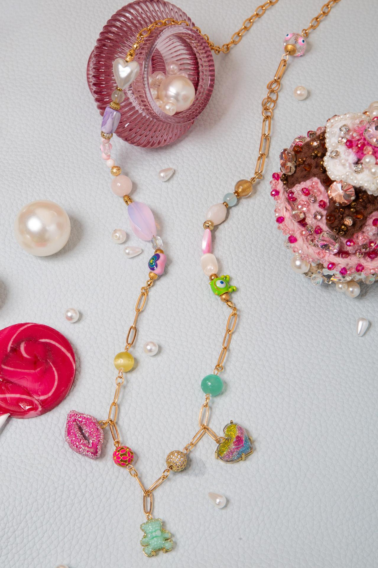 A stainless steel and enameled necklace with natural stones pearls and playful charms, featuring a rainbow heart and a mint bear pendant. Crafted using upcycled and recycled materials, this necklace reflects MiniMe Paris’s commitment to creativity and conscious fashion.