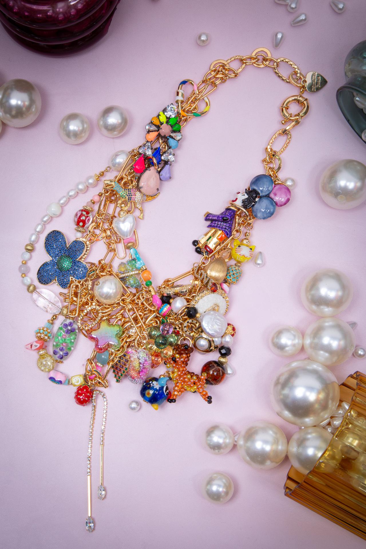 A gold tone stainless steel necklace loaded with colorful charms, beads and playful pendants.