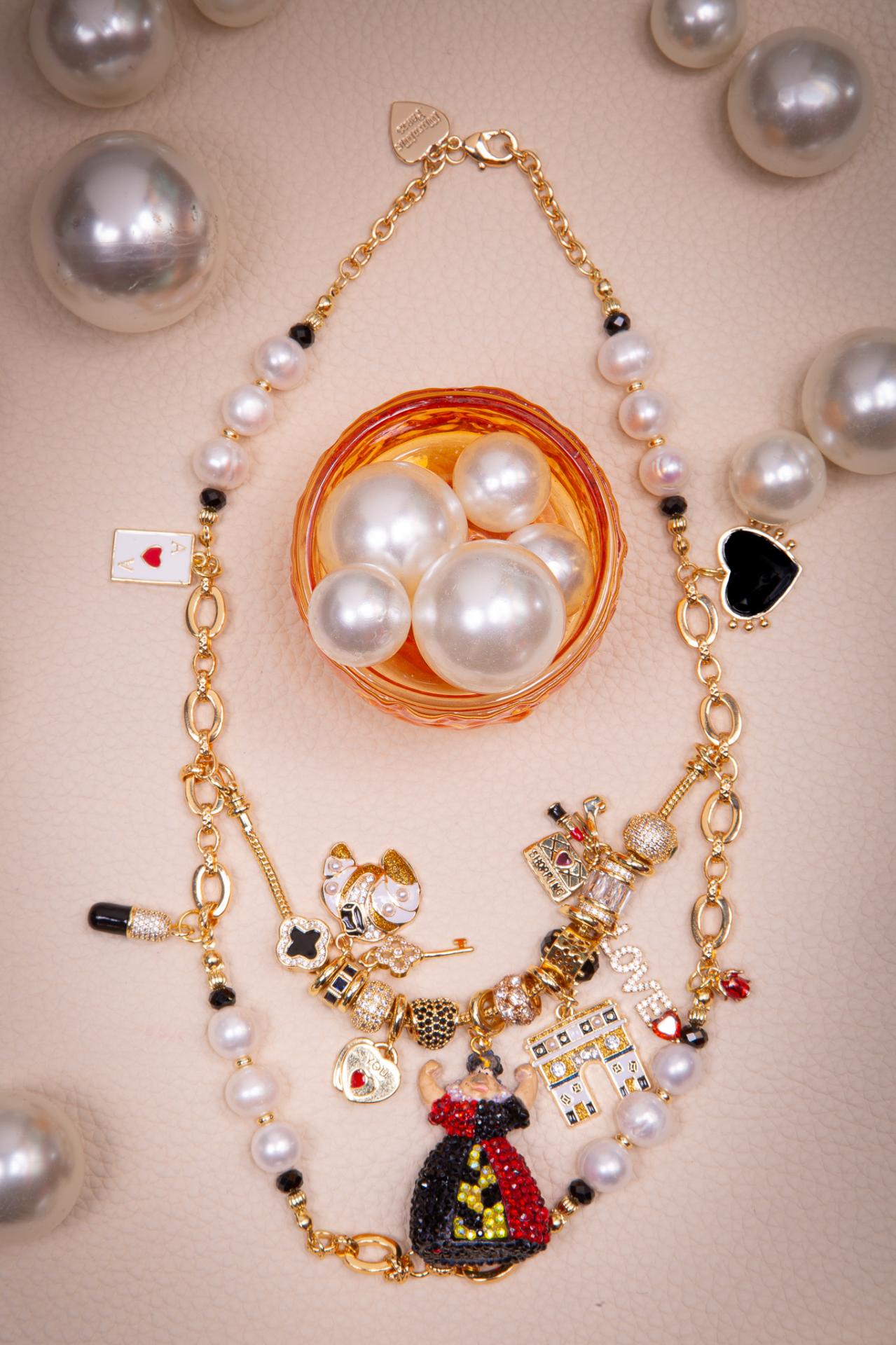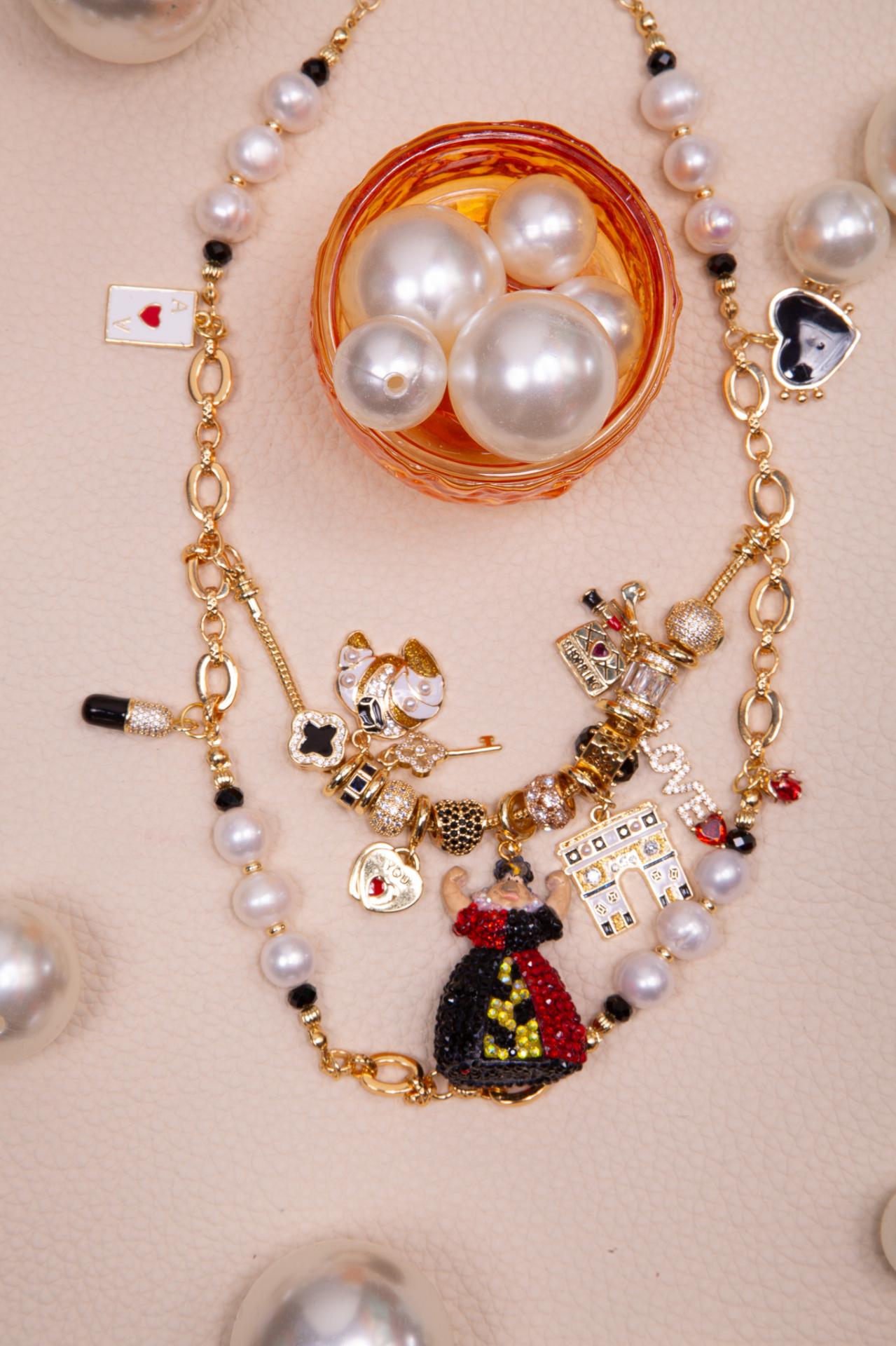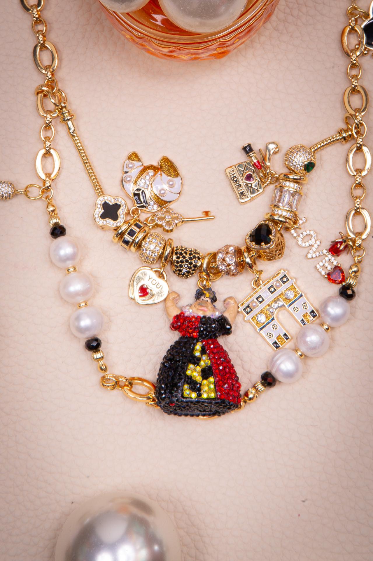 A stainless steel and enameled necklace with pearls stones and assorted charms, finished with a sparkling queen puppet pendant. Crafted using upcycled and recycled materials, this necklace reflects MiniMe Paris’s commitment to creativity and conscious fashion.