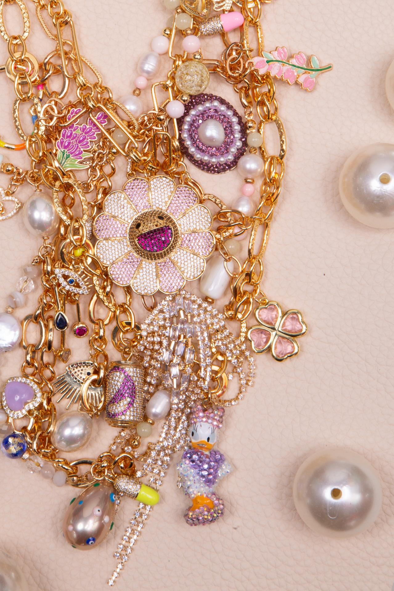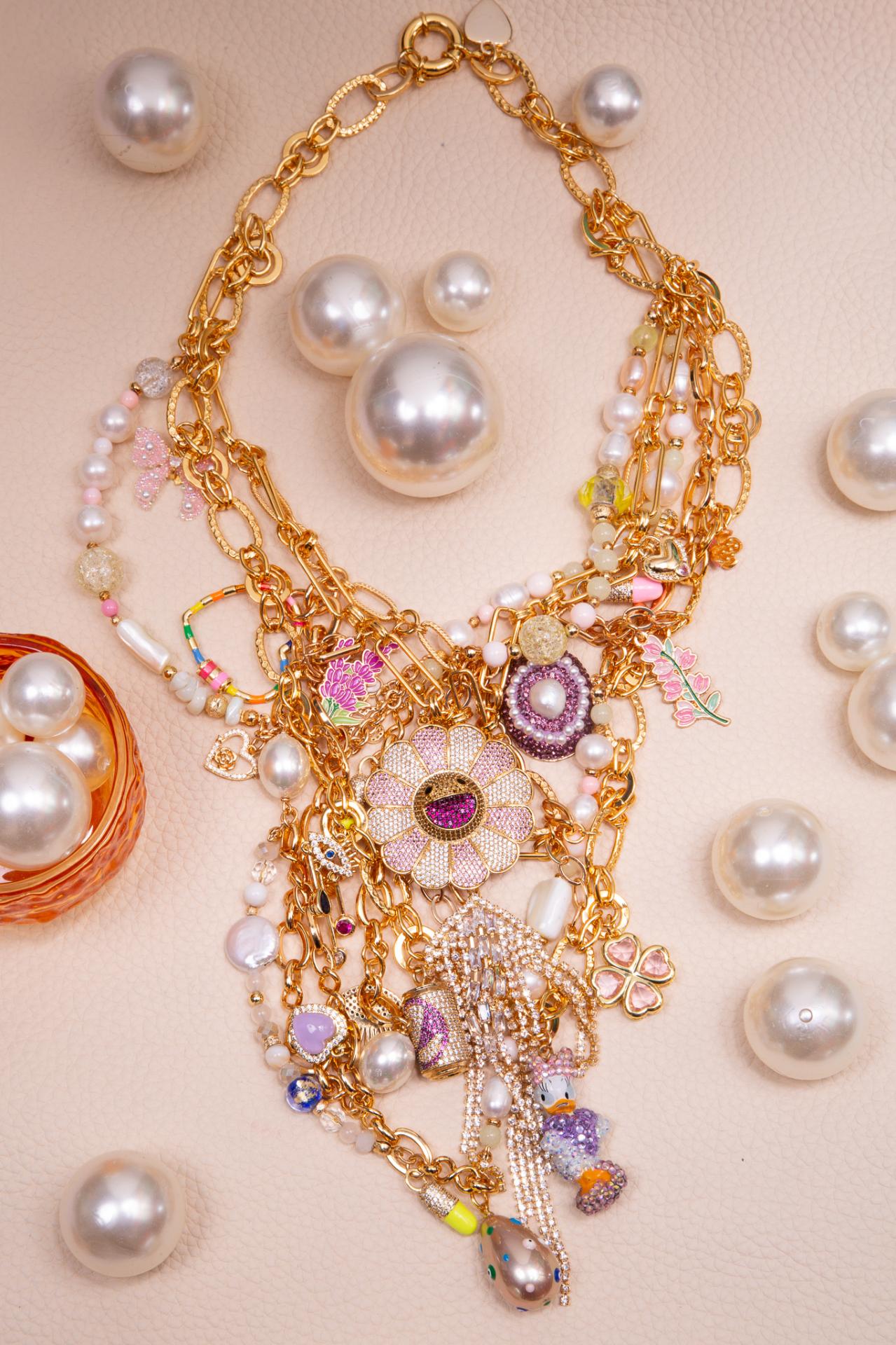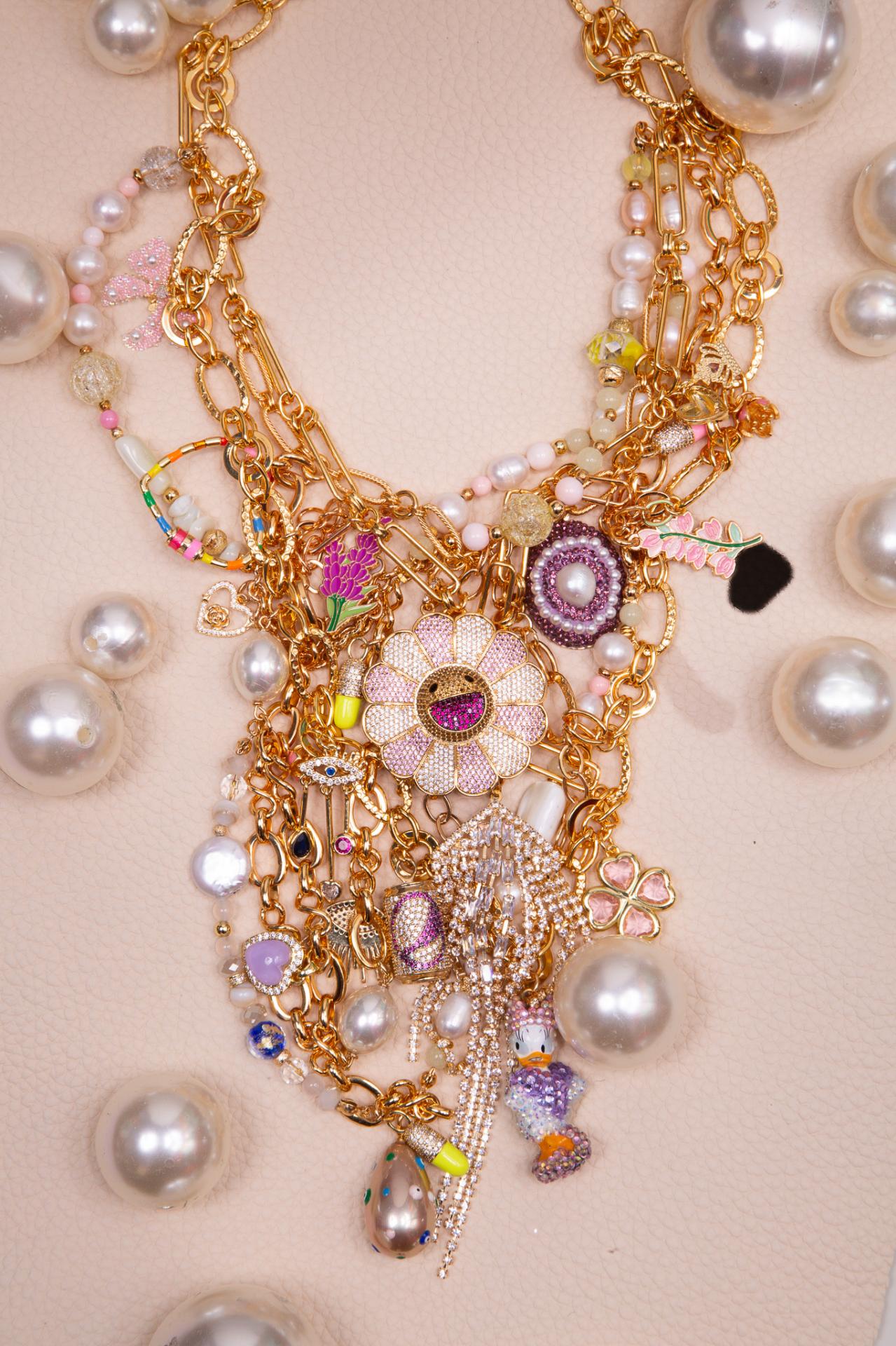 A stainless steel and enameled necklace with pearls stones and assorted charms, highlighted by a large floral pendant and decorative drops. Crafted using upcycled and recycled materials, this necklace reflects MiniMe Paris’s commitment to creativity and conscious fashion.