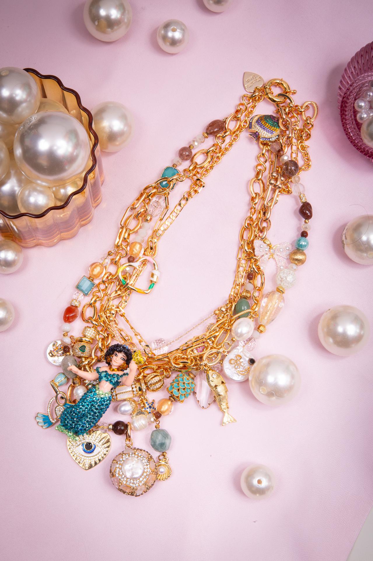 A stainless steel and enameled necklace with pearls stones and assorted charms, finished with a sparkling princess pendant. Crafted using upcycled and recycled materials, this necklace reflects MiniMe Paris’s commitment to creativity and conscious fashion.