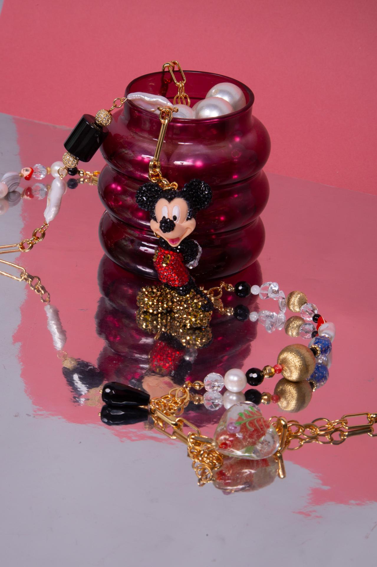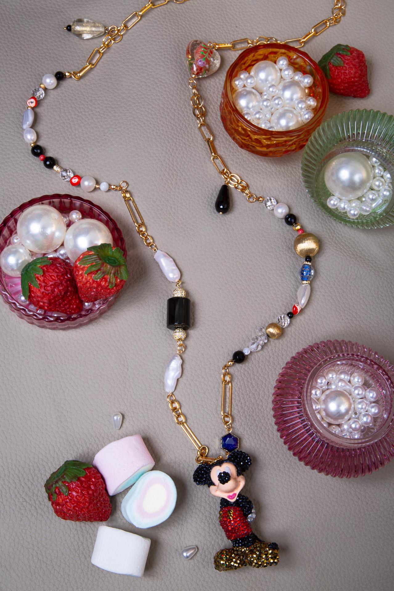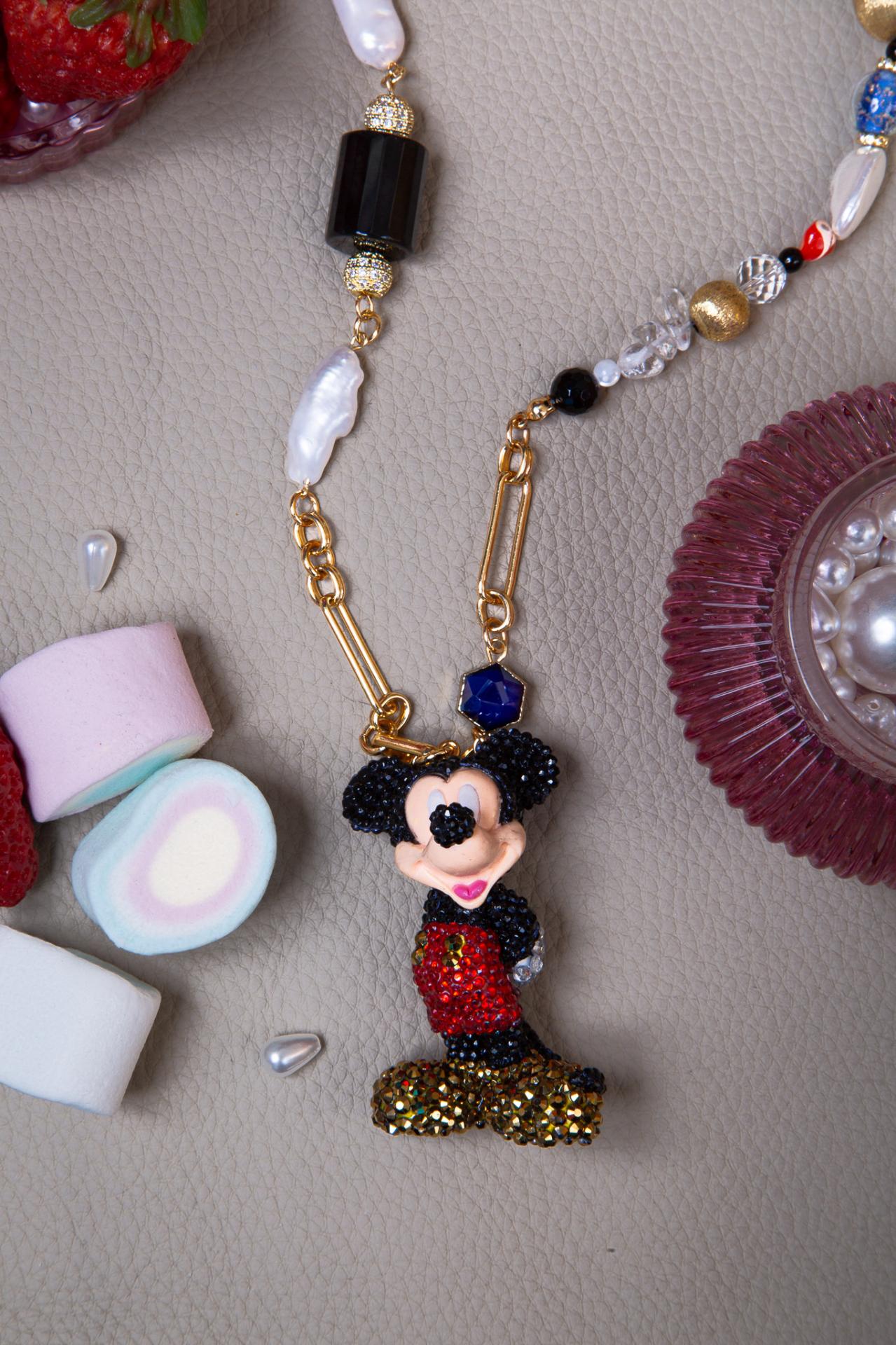 A stainless steel and enameled necklace with natural stones pearls bold beads and a sparkling character pendant.