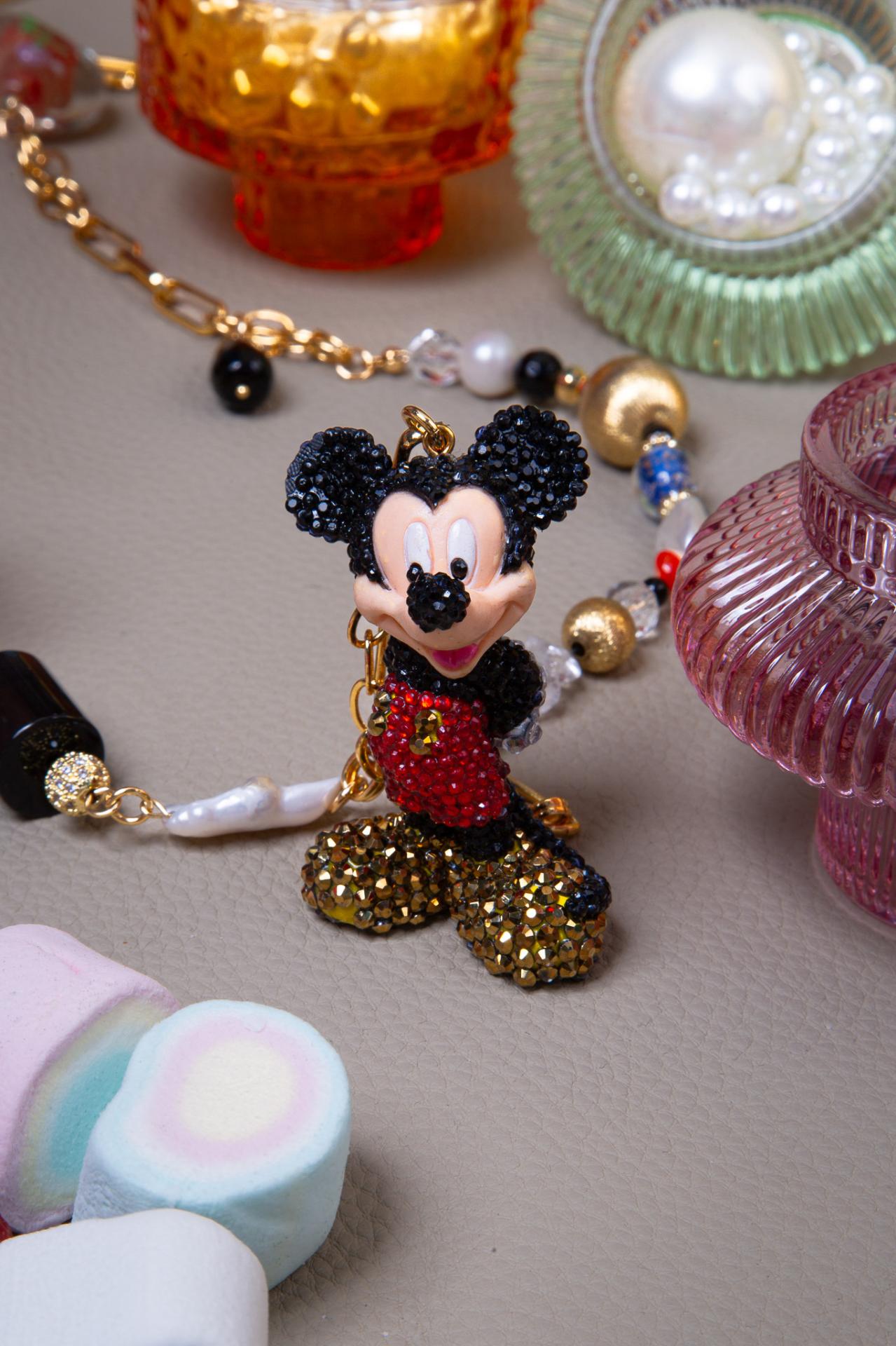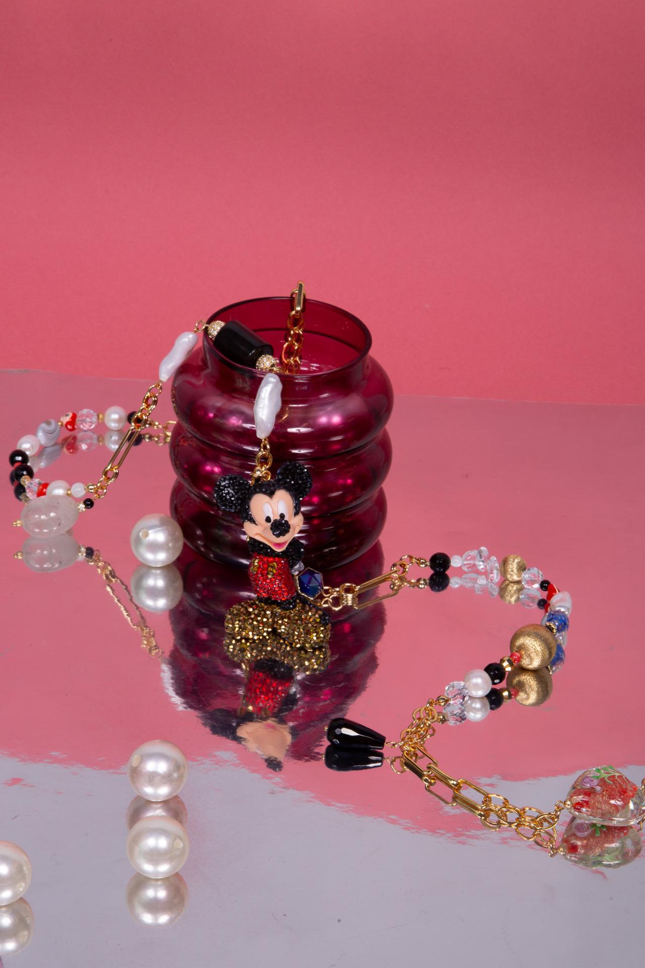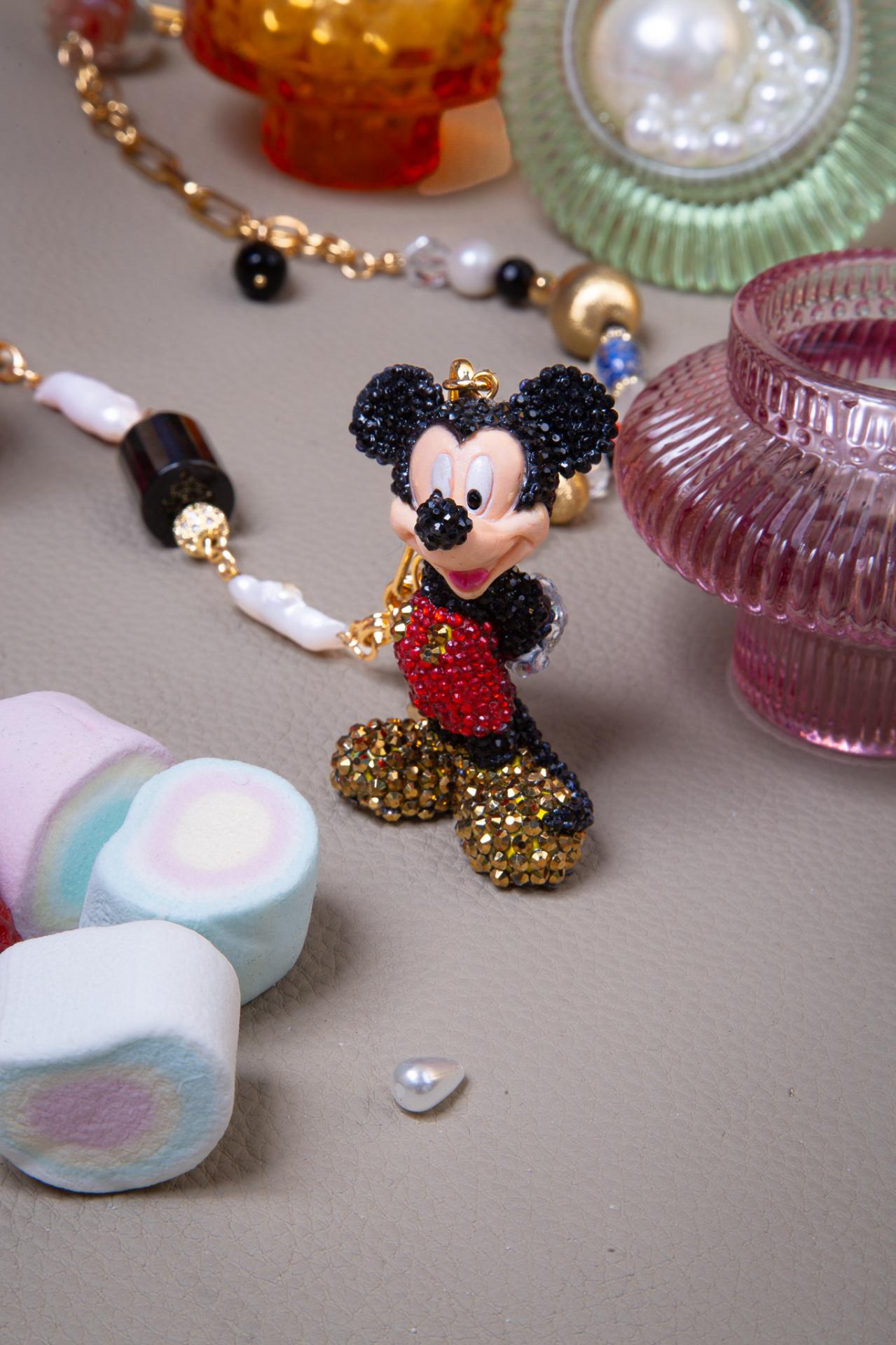 A stainless steel and enameled necklace with natural stones pearls bold beads and a sparkling character pendant.