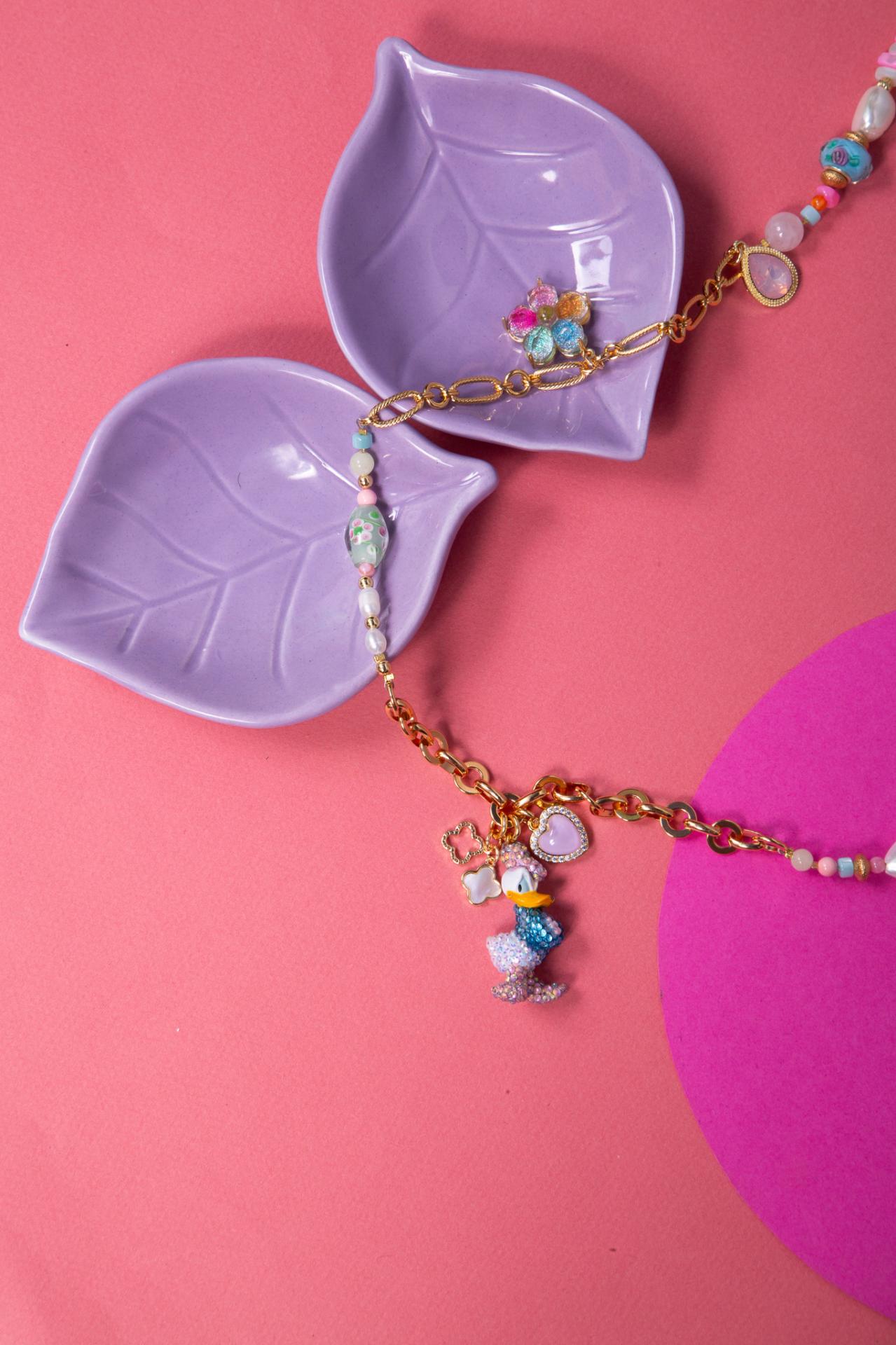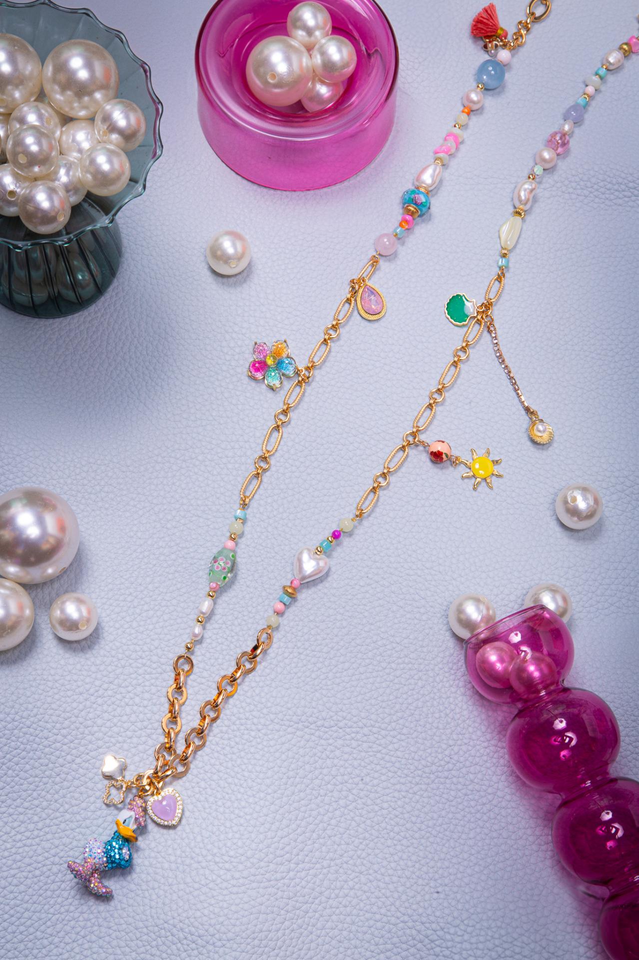 A stainless steel and enameled necklace with natural stones pearls pastel beads and a sparkling duck charm.