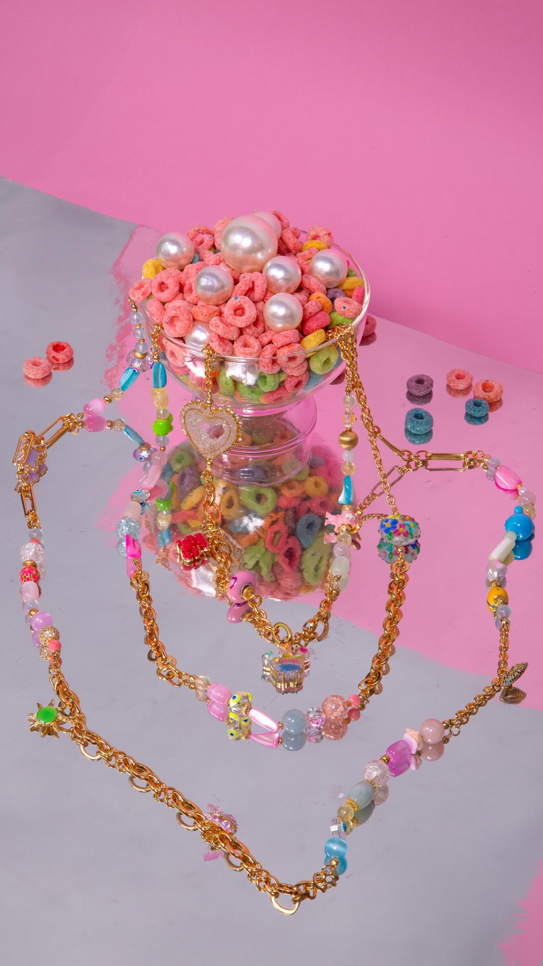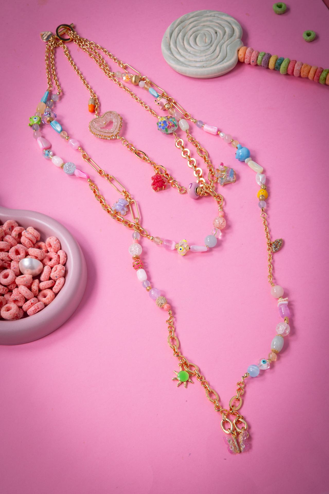 A stainless steel and enameled necklace with natural stones pearls pastel beads and a sparkling butterfly pendant with a golden sun charm.