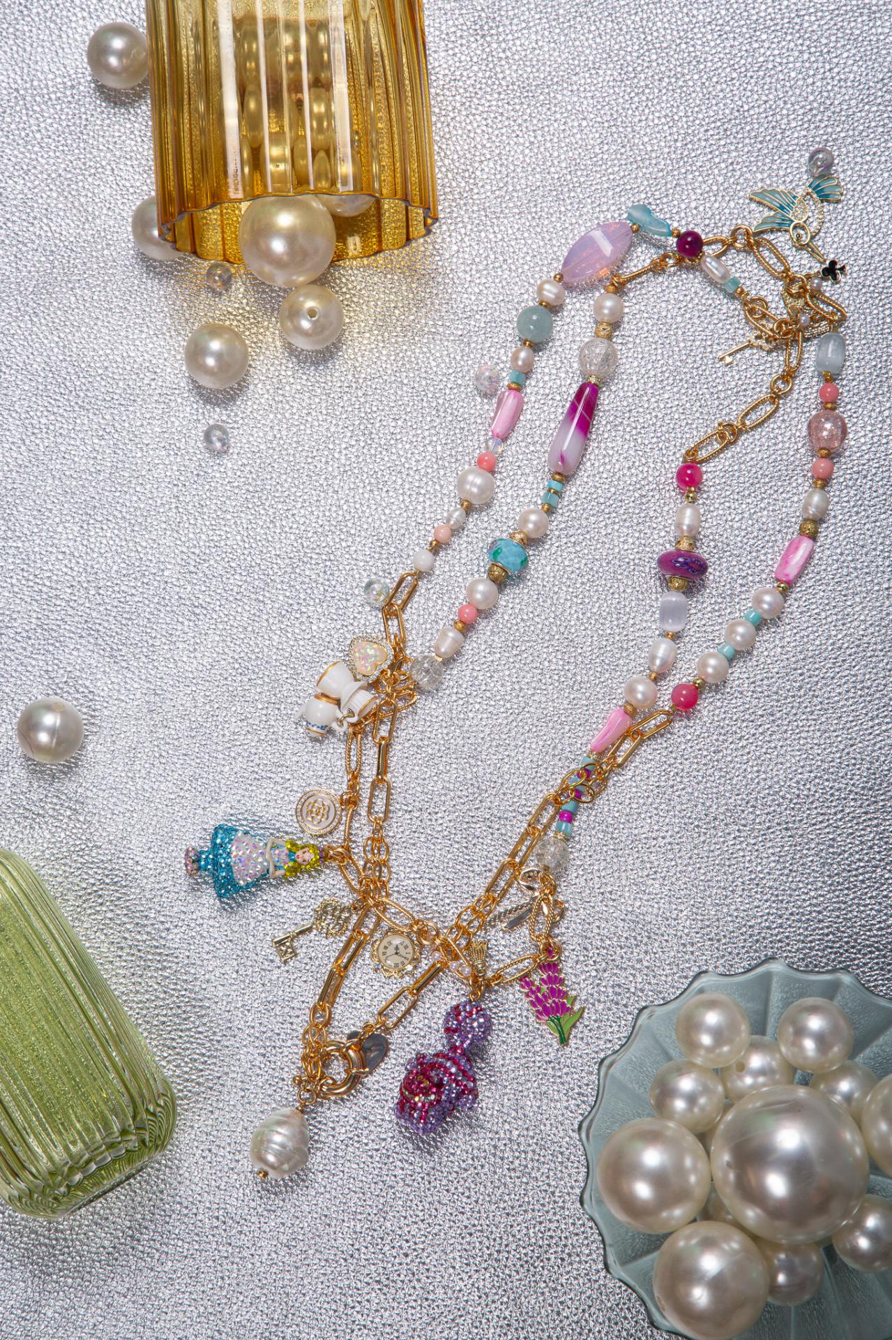A stainless steel and enameled necklace with natural stones pearls pastel beads and whimsical fairytale inspired charms.