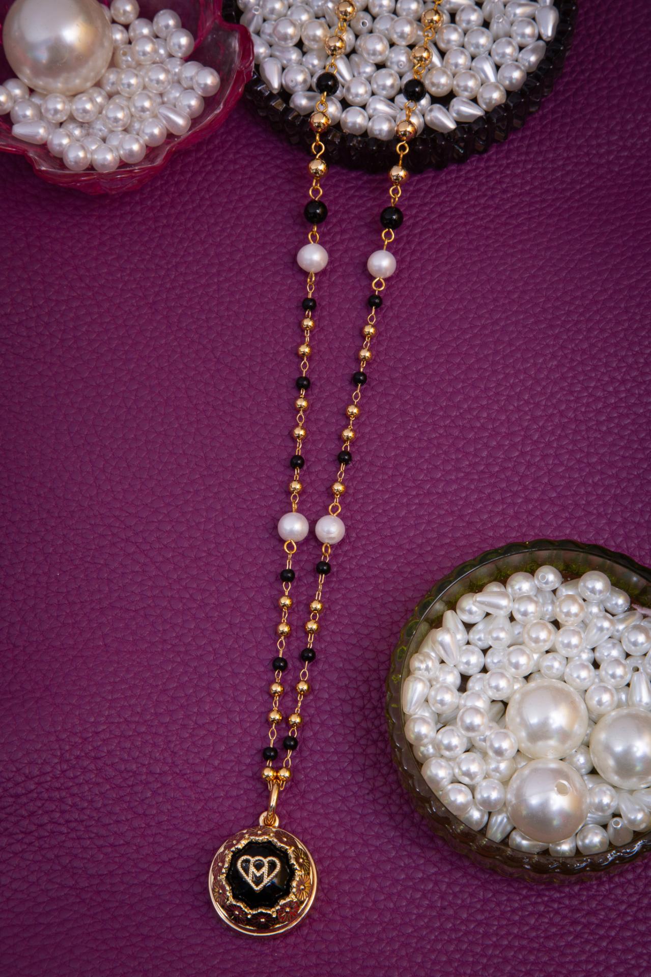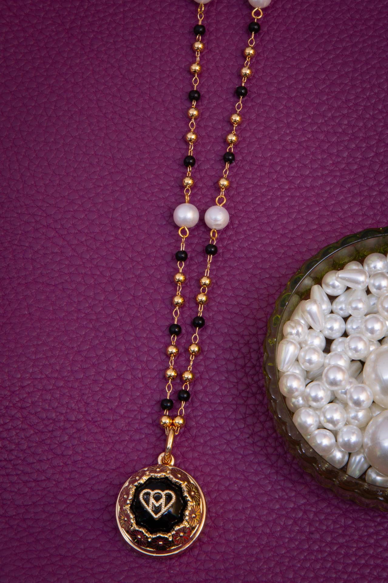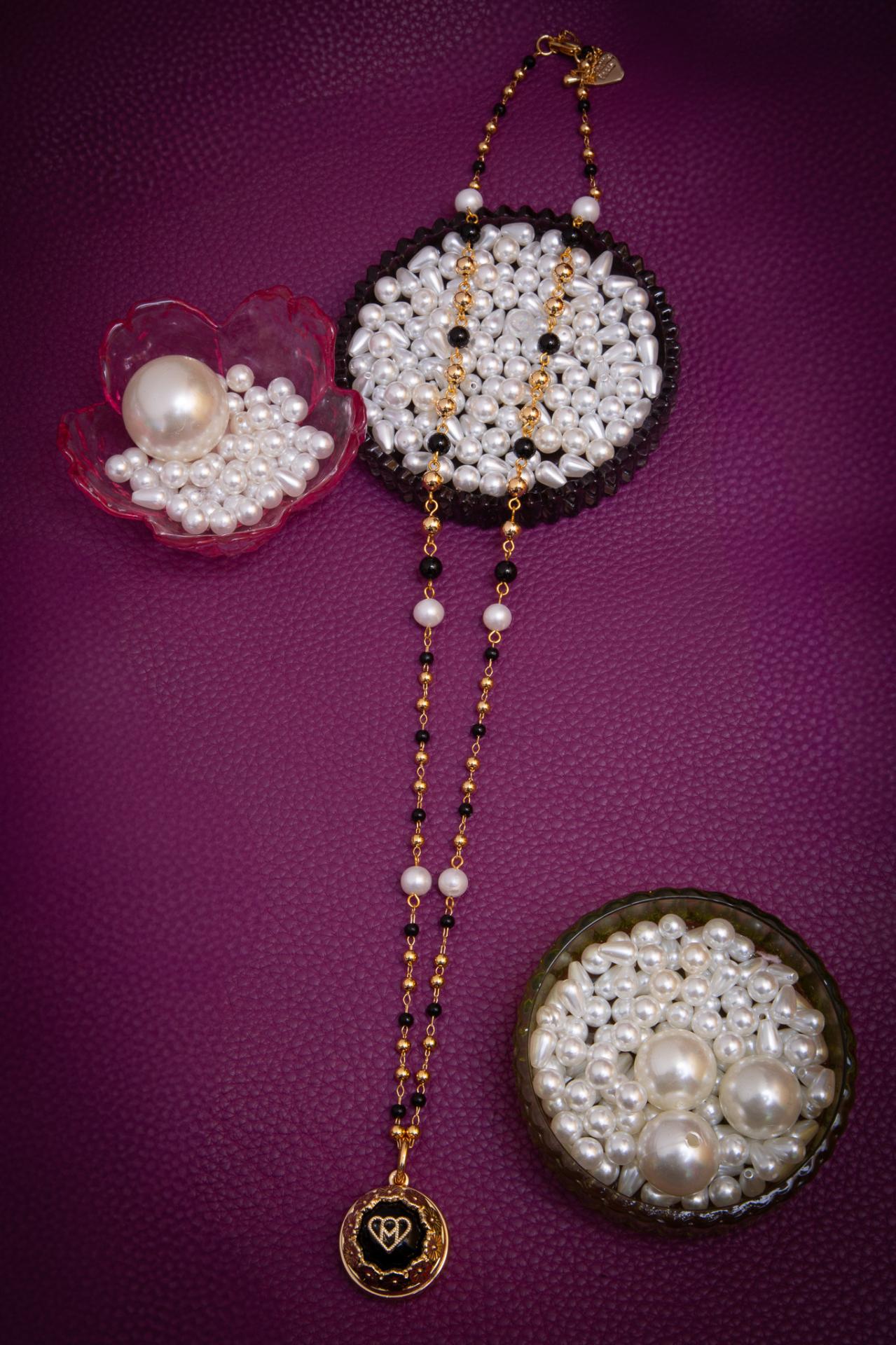 A black and gold stainless steel necklace with pearls and a MiniMe emblem pendant.