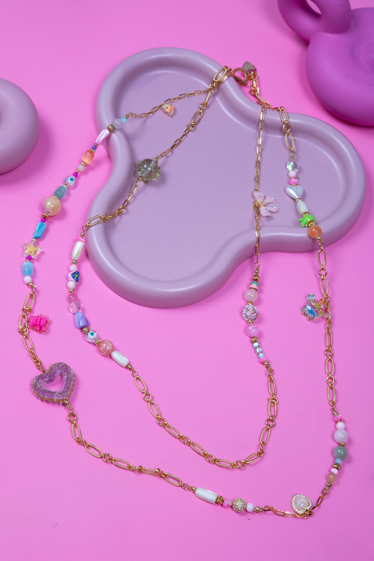 A stainless steel and enameled necklace with natural stones pearls pastel charms and a sparkling lavender heart pendant.