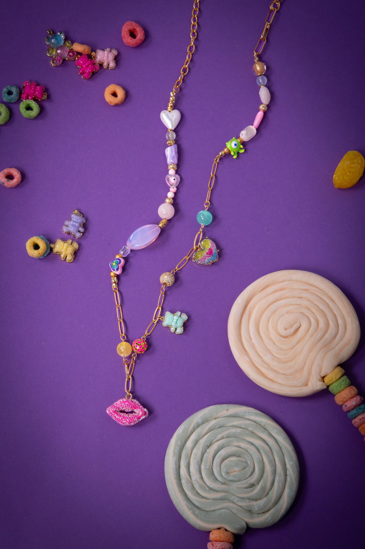 A stainless steel and enameled necklace with natural stones pearls pastel charms and a sparkling pink kiss pendant.