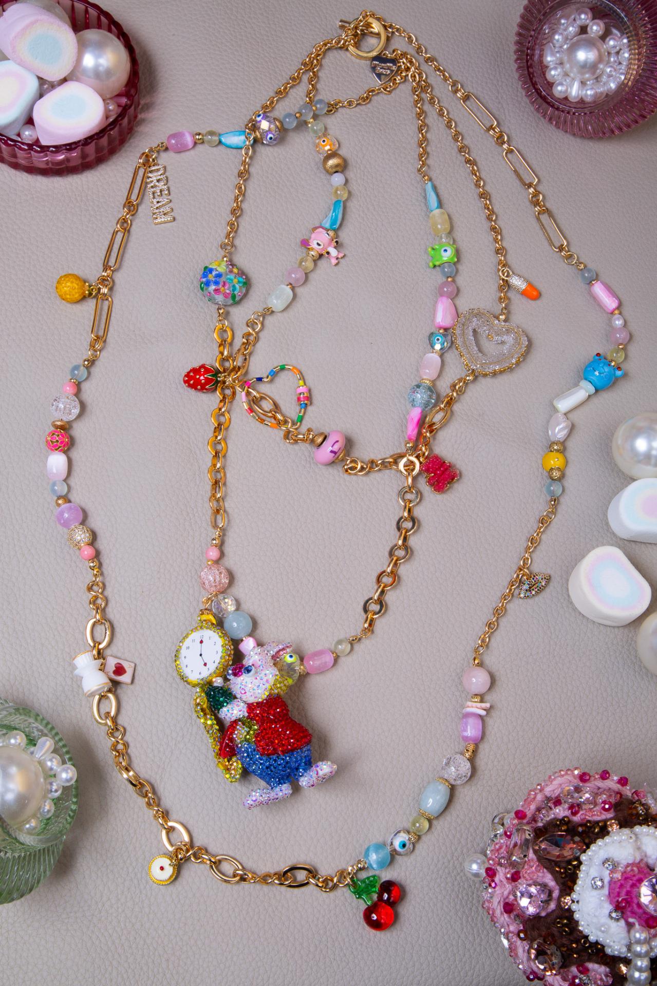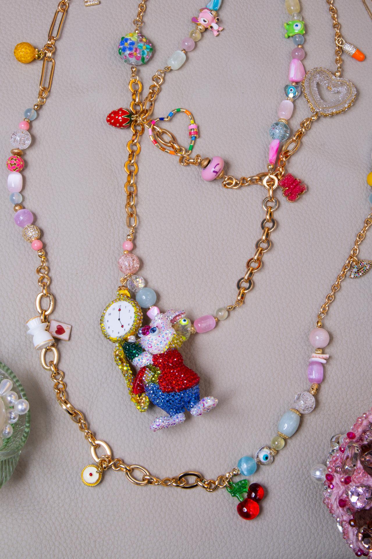 A stainless steel and enameled necklace with pearls stones and playful charms, finished with a sparkling white rabbit pendant. Crafted using upcycled and recycled materials, this necklace reflects MiniMe Paris’s commitment to creativity and conscious fashion.