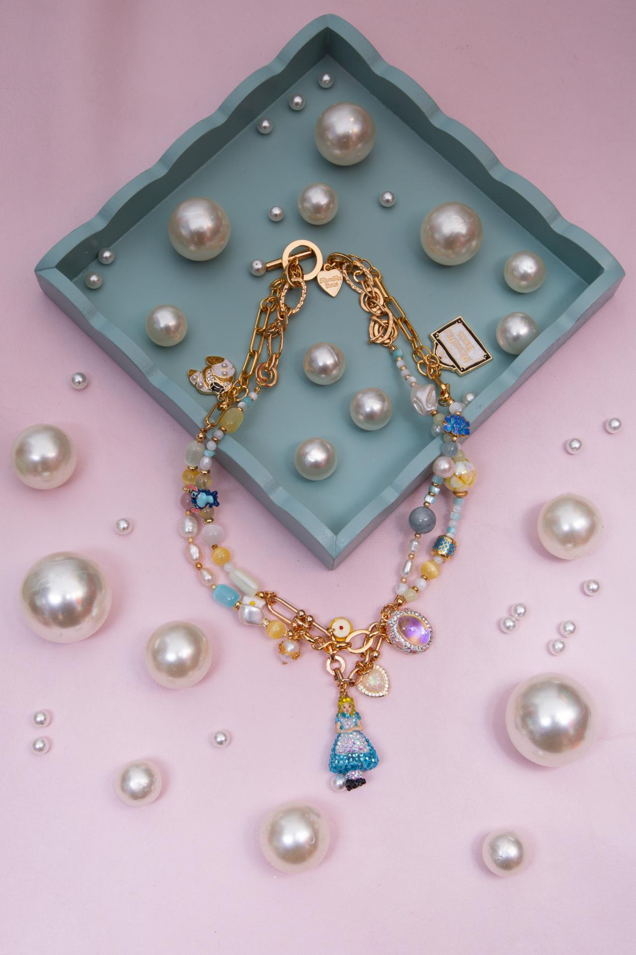 A stainless steel and enameled necklace with natural stones pearls pastel beads and a sparkling fairytale character pendant.