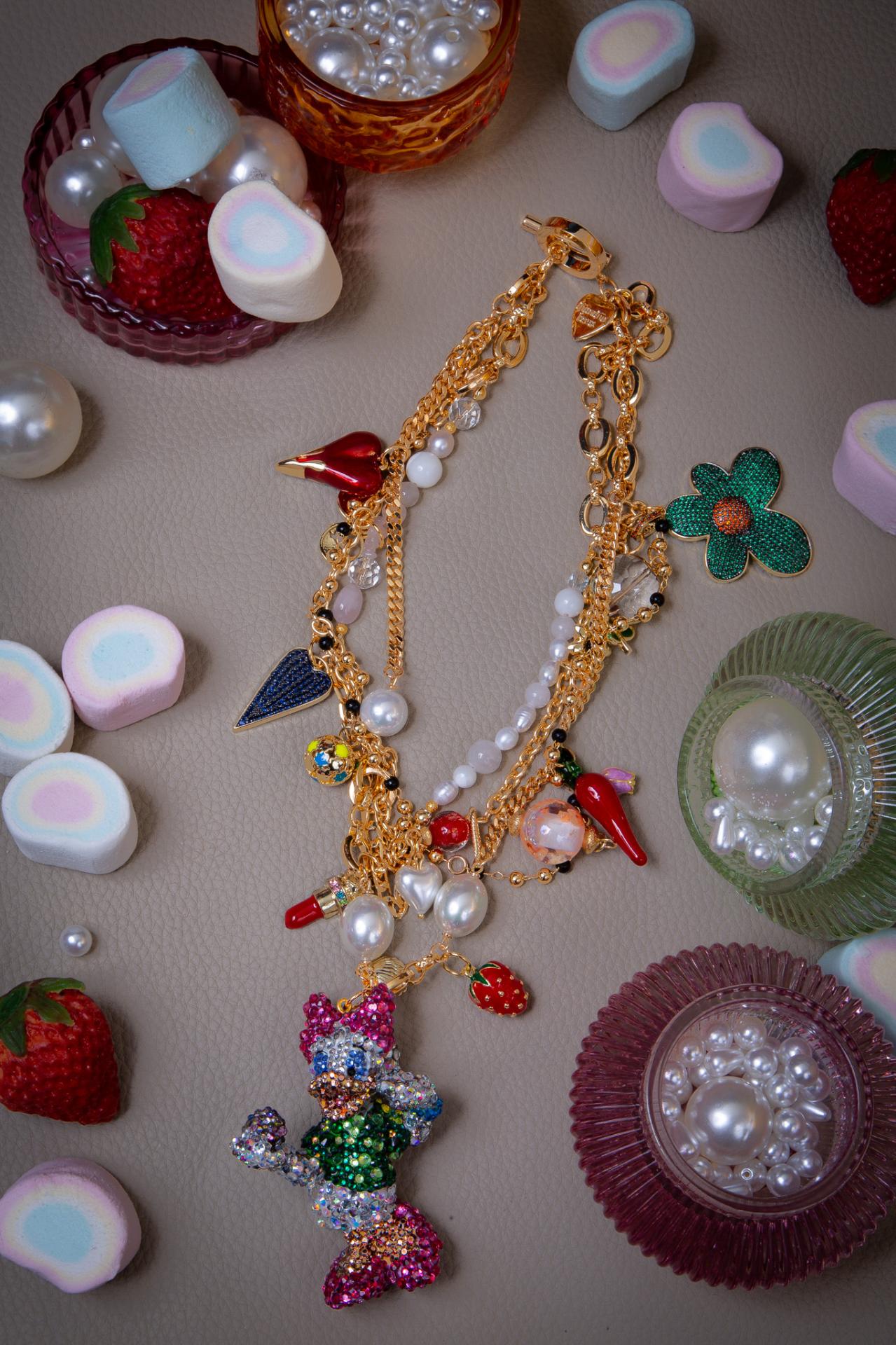A stainless steel and enameled necklace with pearls stones and playful charms, finished with a sparkling duck puppet pendant. Crafted using upcycled and recycled materials, this necklace reflects MiniMe Paris’s commitment to creativity and conscious fashion.