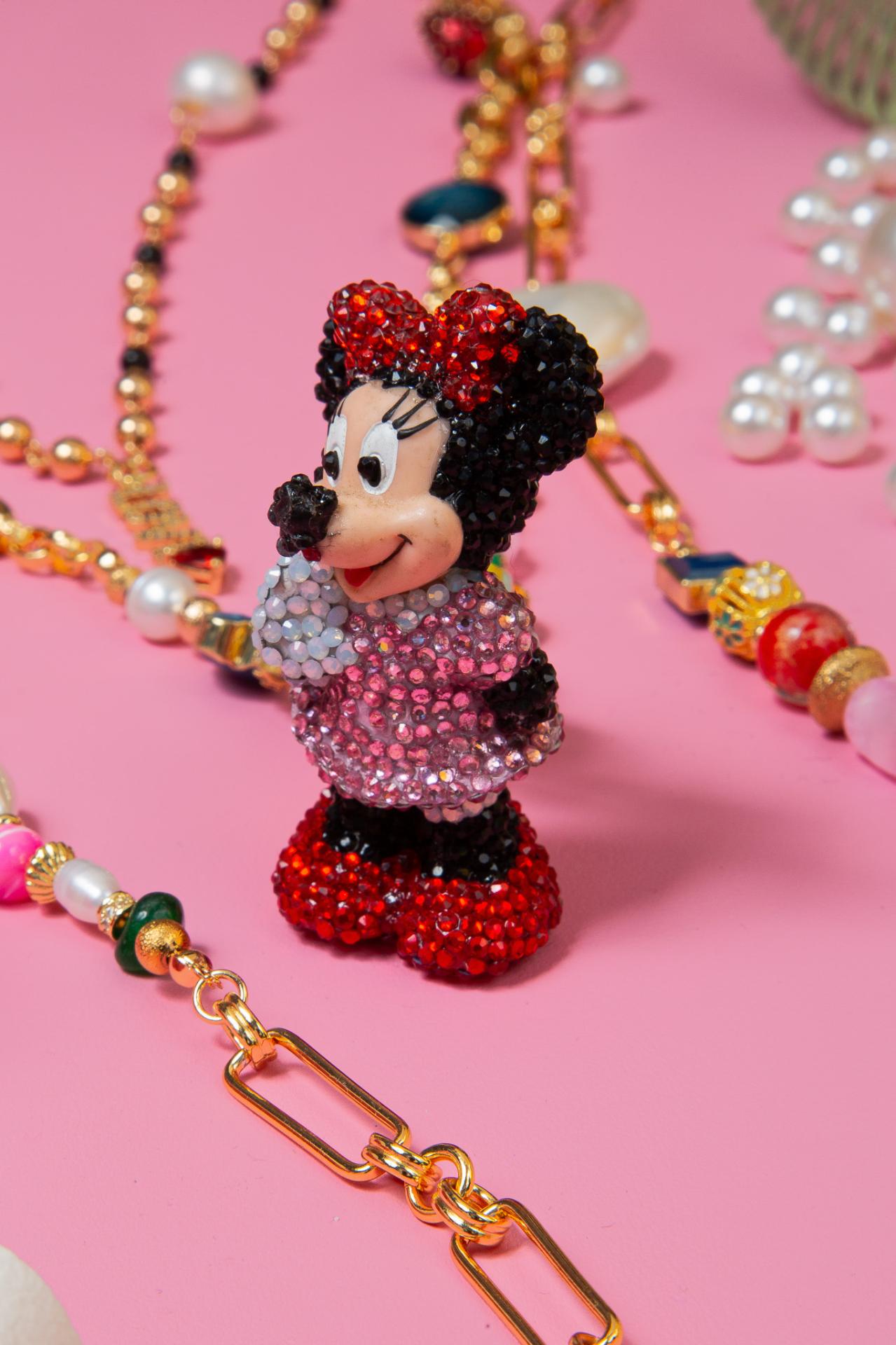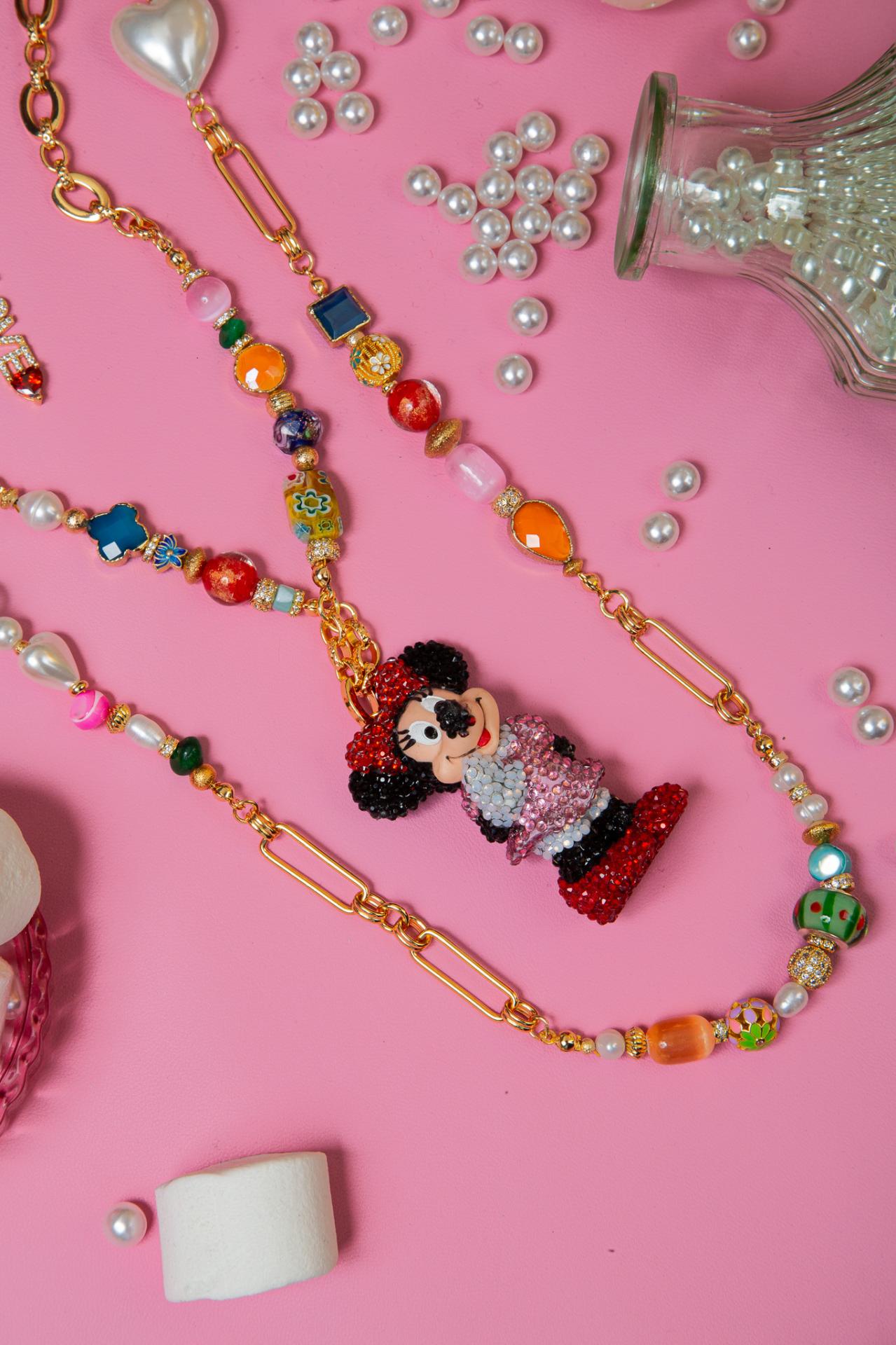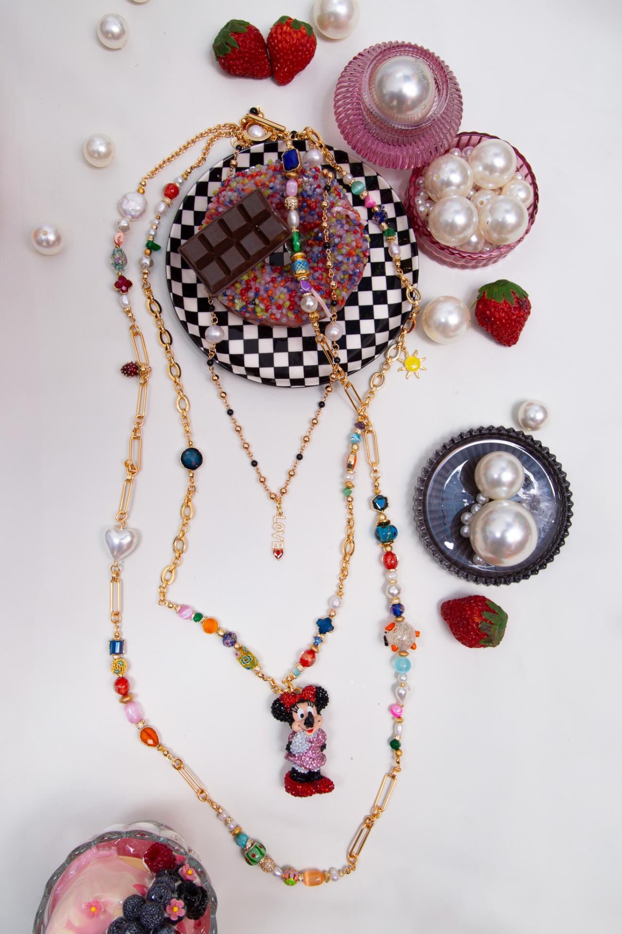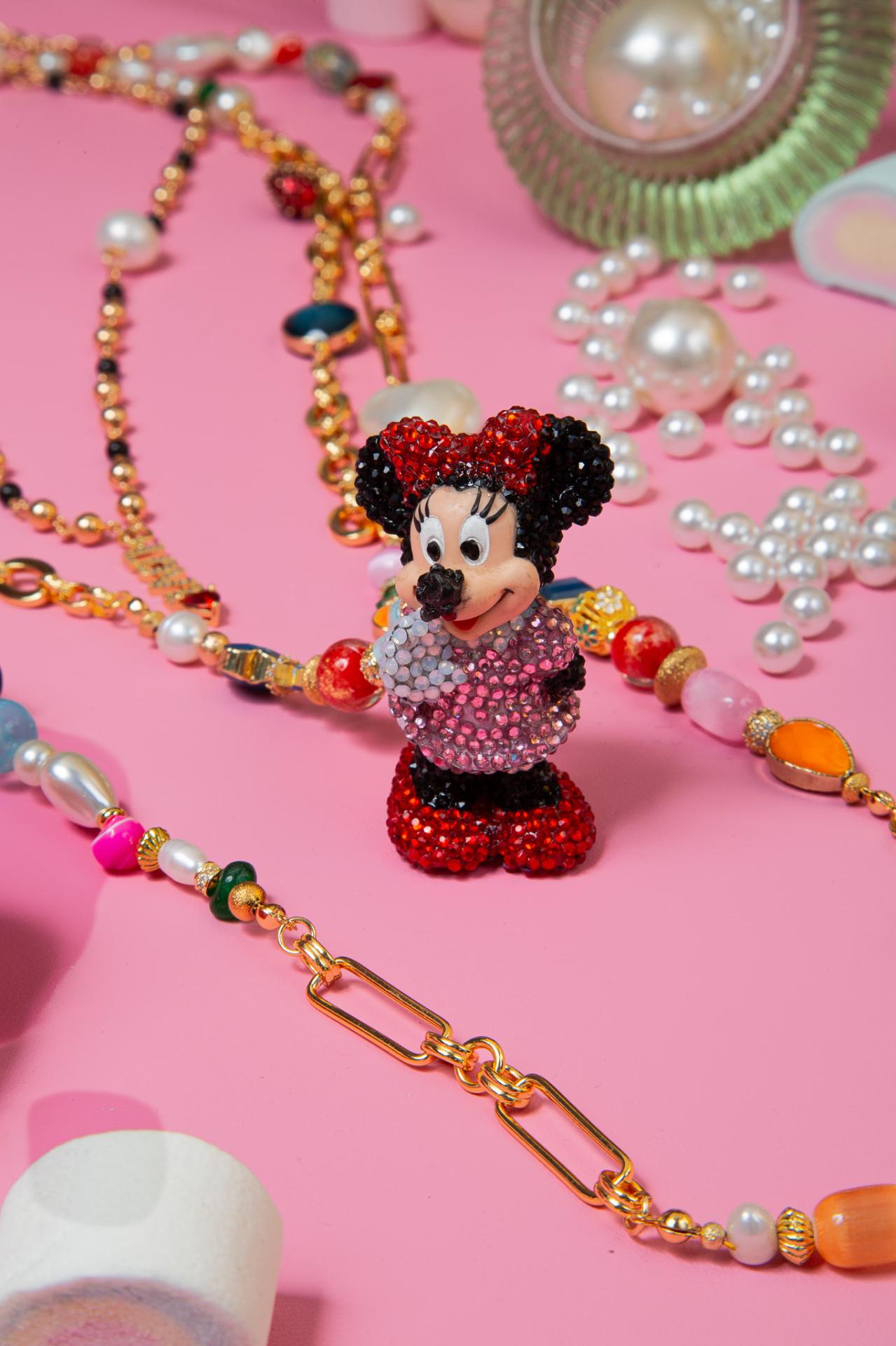 A stainless steel and enameled necklace with pearls stones and playful charms, finished with a sparkling mouse pendant. Crafted using upcycled and recycled materials, this necklace reflects MiniMe Paris’s commitment to creativity and conscious fashion.