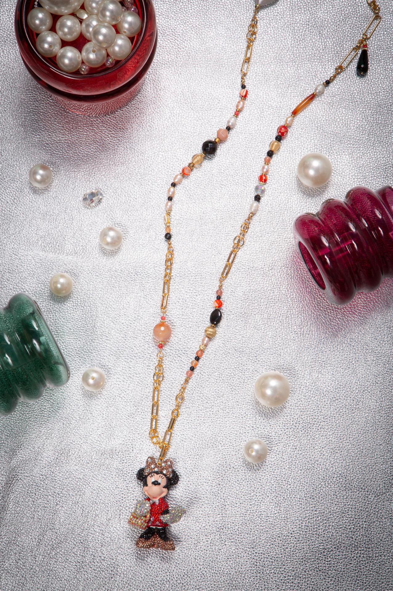 A stainless steel and enameled necklace with natural stones pearls red and black beads and a sparkling crystal character charm.