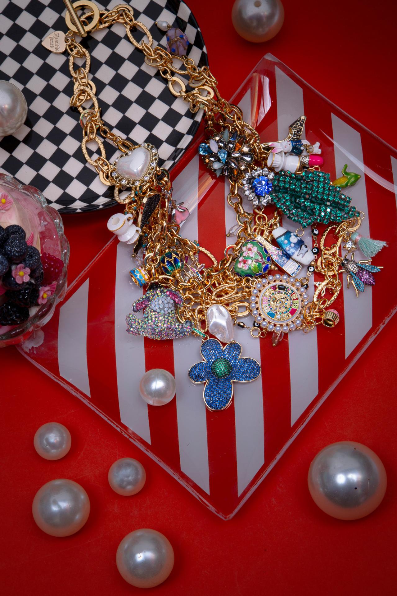 A stainless steel and enameled statement necklace with natural stones, pearls and an eclectic mix of colorful charms.