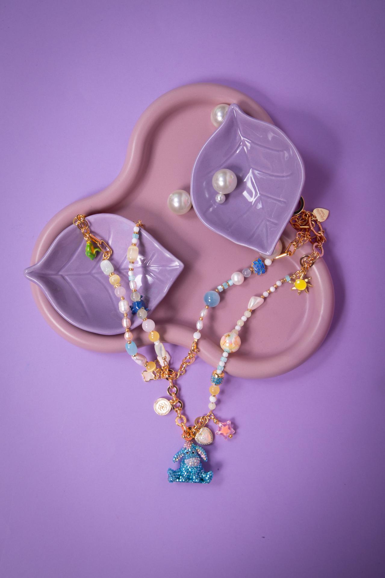 A stainless steel necklace mixing pastel beads natural stones gold chains and playful charms finished with a sparkling blue donkey pendant crafted using upcycled and recycled materials.