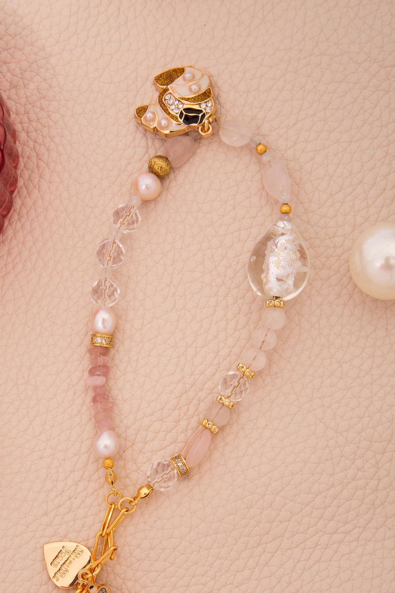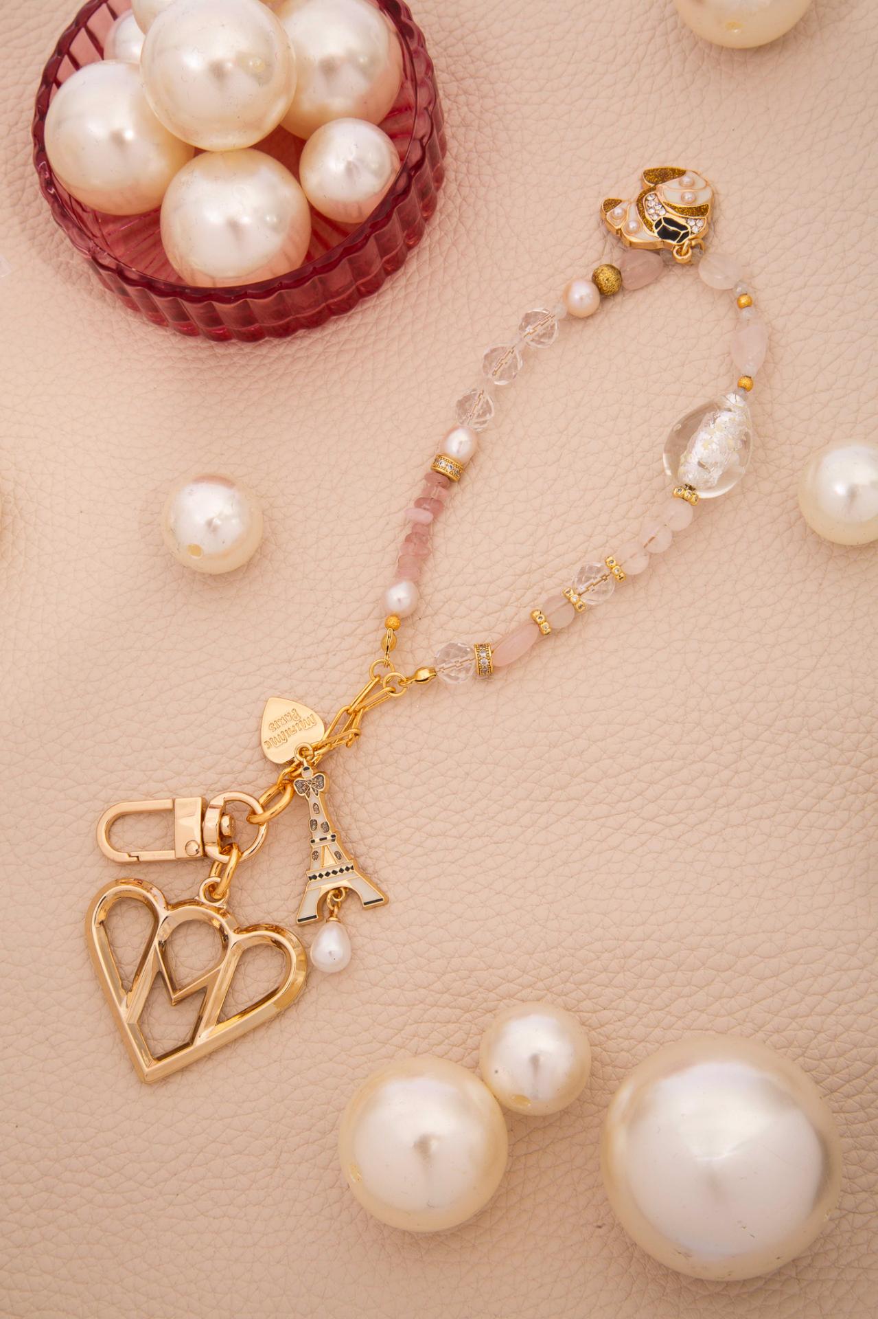 A soft pink beaded phone strap with pearls, clear beads, gold accents, and an Eiffel Tower charm.