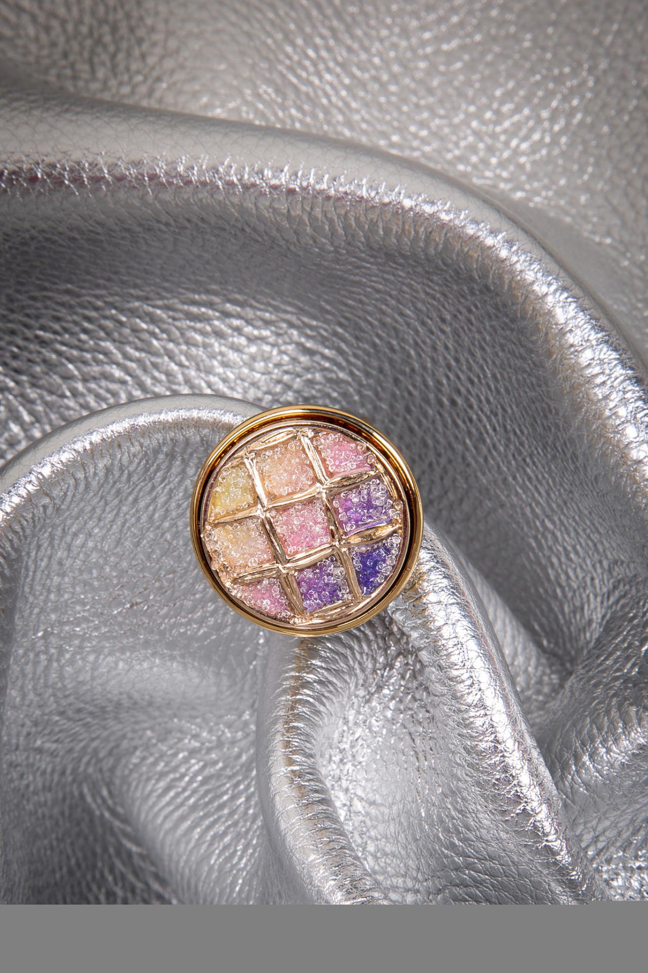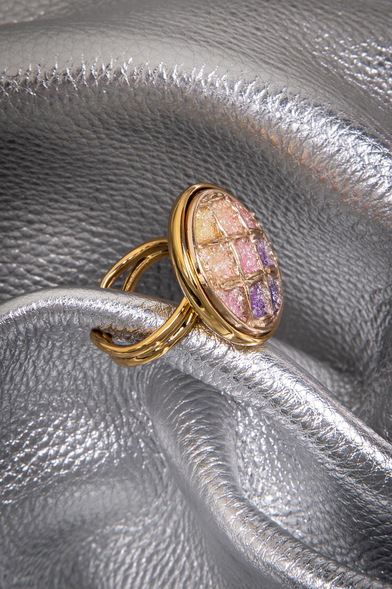 Pastel Grid Glimmer Ring, candy-colored geometry and glittering texture in a chic gold setting. Sweet, modern, and mood-lifting.